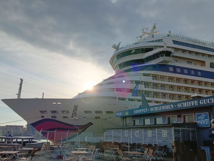 Auge in Augen mit dem schönen Kussmundschiff. So nah liegt es vor mir, dennoch ist es heute unerreichbar für mich. Ein kameraüberwachter Zaun trennt den Bereich, in dem Kreuzfahrtträume beginnen von den "See(h)leuten", wie ich es heute bin. Leider ...