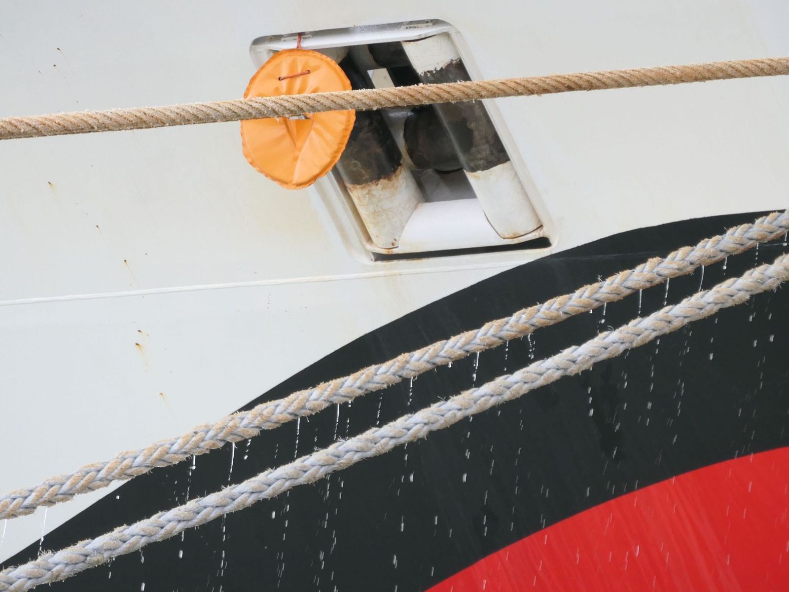Das Wasser tropft noch von den stramm gespannten Tauen.