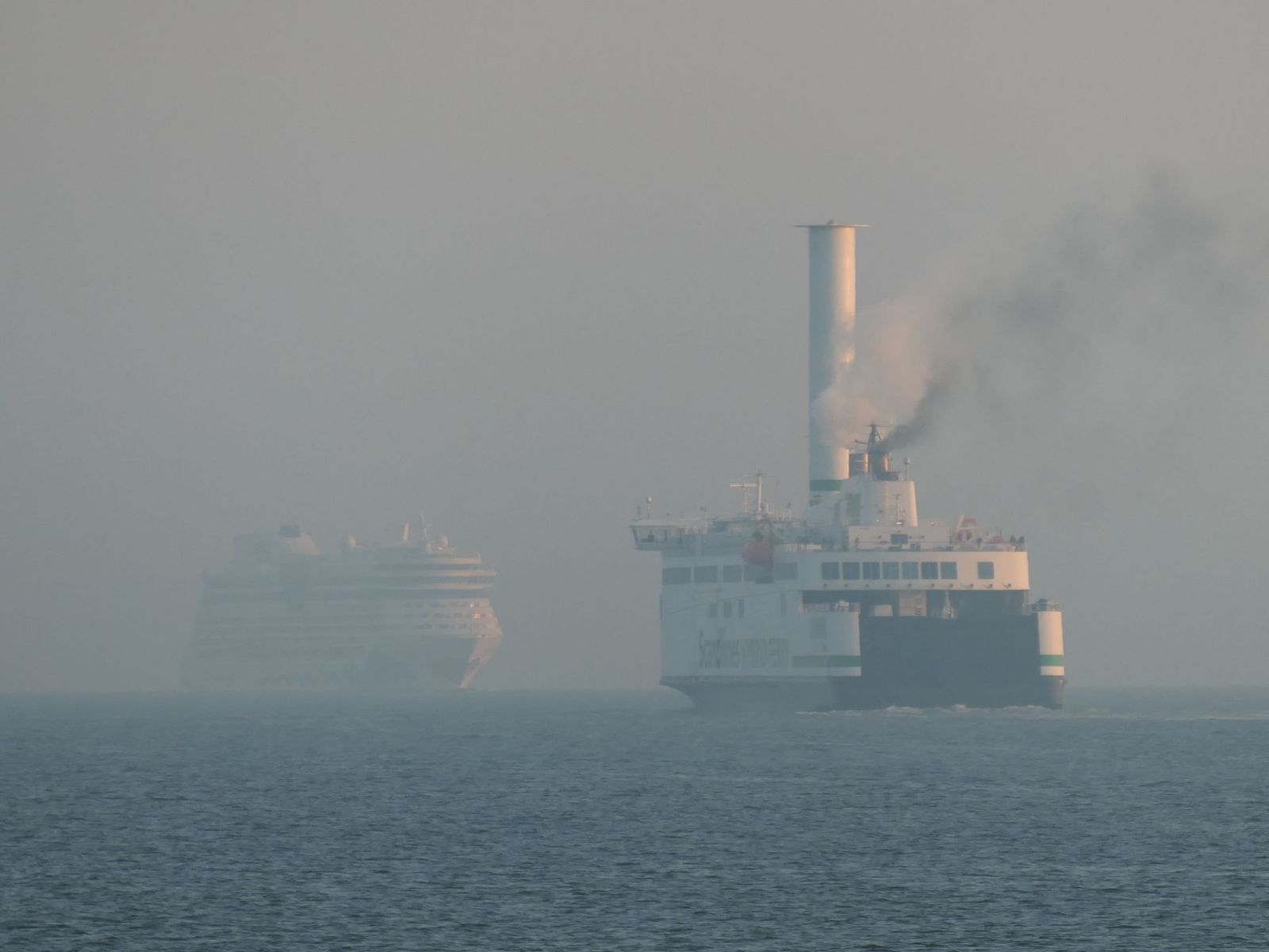 ). Um diese Zeit war sie am Horizont noch nicht zu sehen, aber rund 30 Minuten später tauchte sie schemenhaft auf, wurde größer und größer:Wie gesagt, leider etwas im Dunst, aber das machte es fast ein bisschen mystisch.