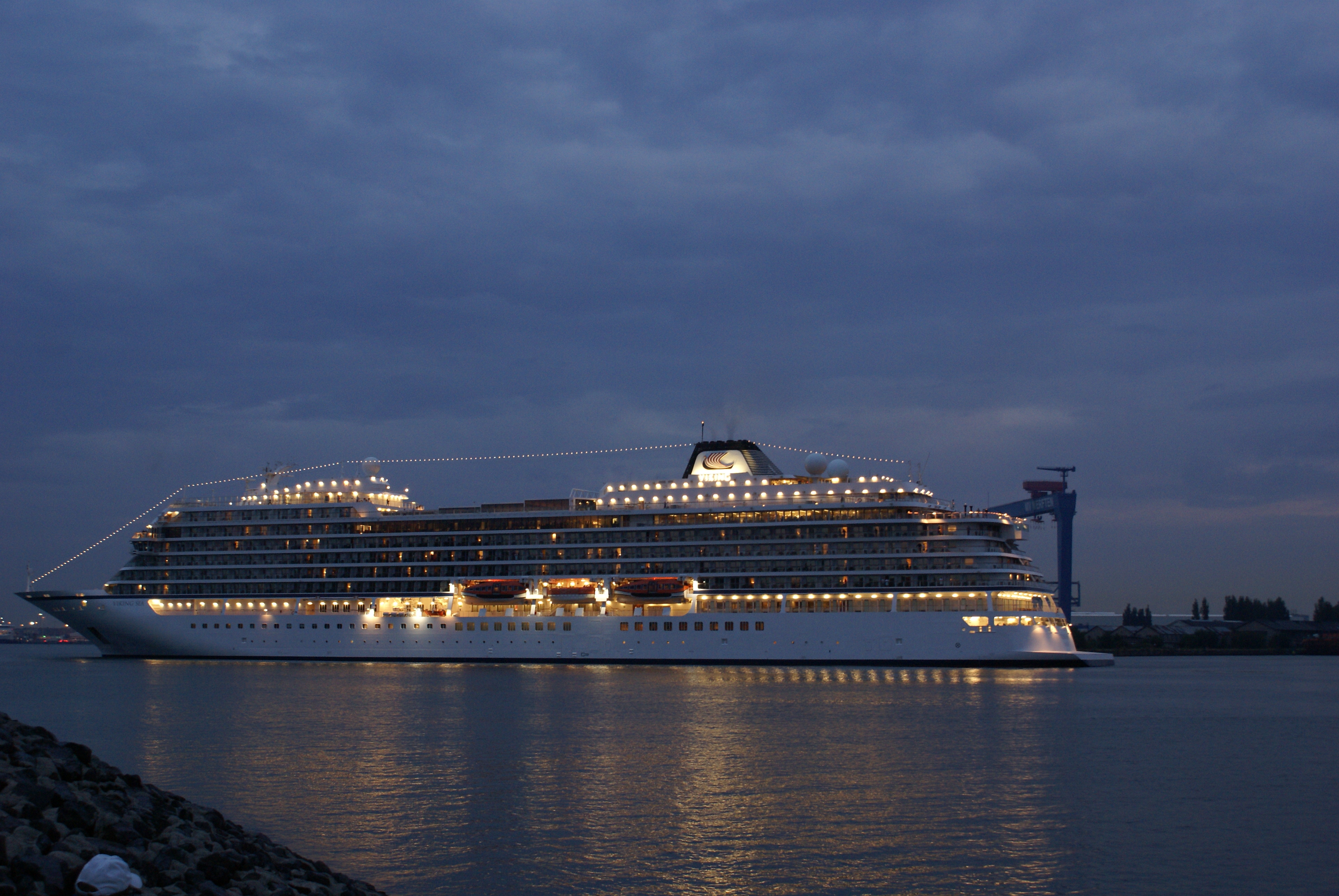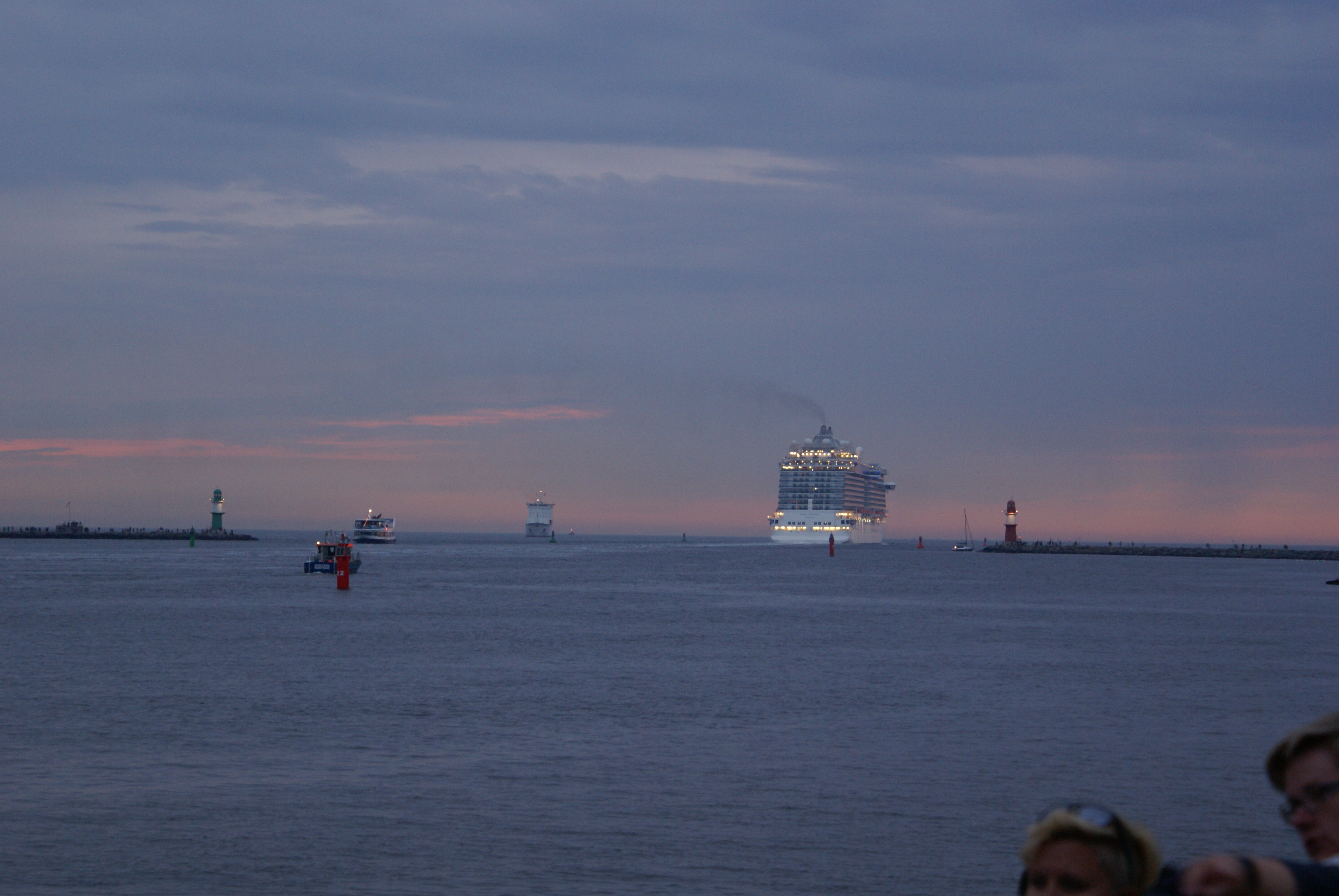 Die Viking Sea verläßt als letztes Kreuzfahrtschiff - mit 30 minütiger Verspätung - das Ostseebad Warnemünde...