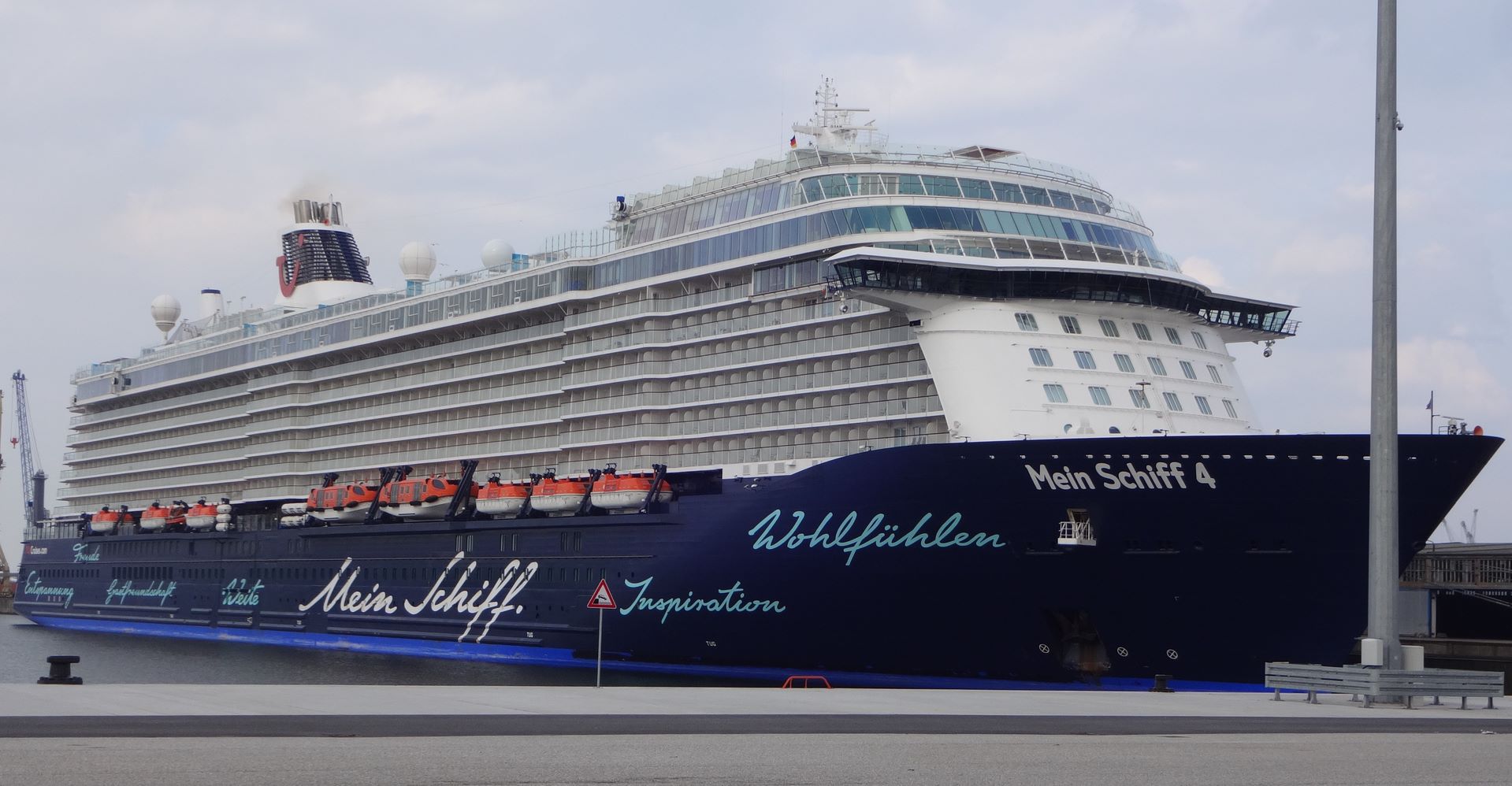 Bei Bilderbuchwetter das Auslaufmanöver der Mein Schiff 6 aus dem Hafen von Rostock-Warnemünde