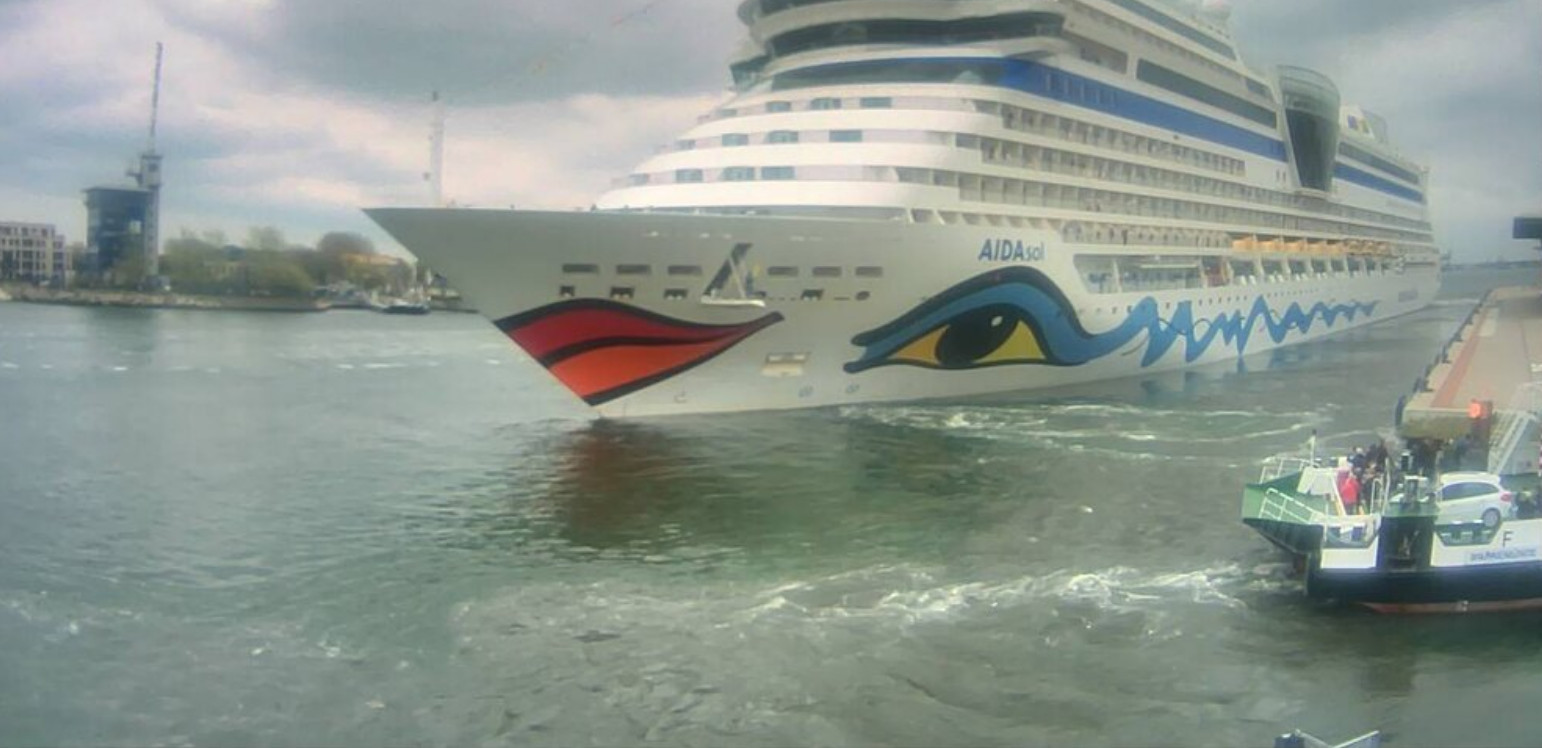 AIDAsol läuft gerade in Wamü ein und geht zum Drehen vor dem Anlegen.