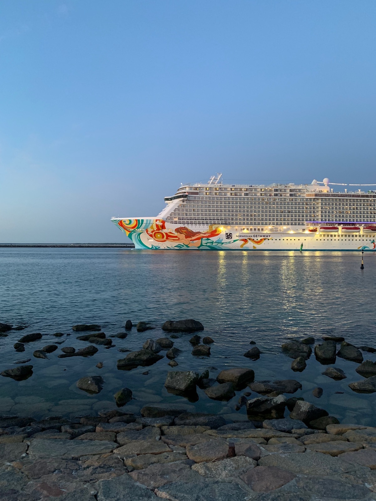 Auslaufmanöver der "Norwegian Getaway" in Warnemünde am 03.06.2022 um 22:00 Uhr