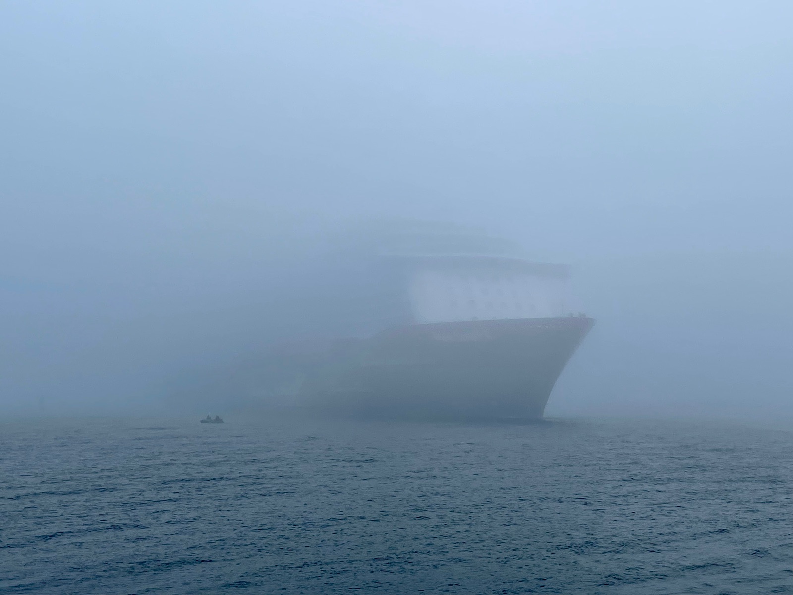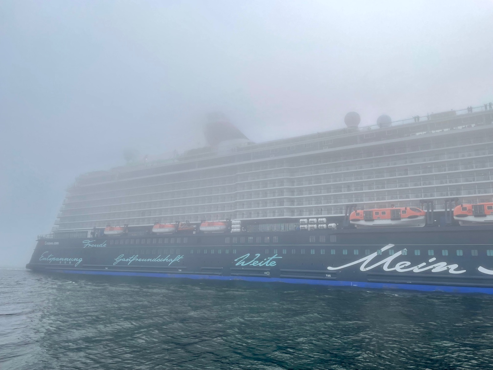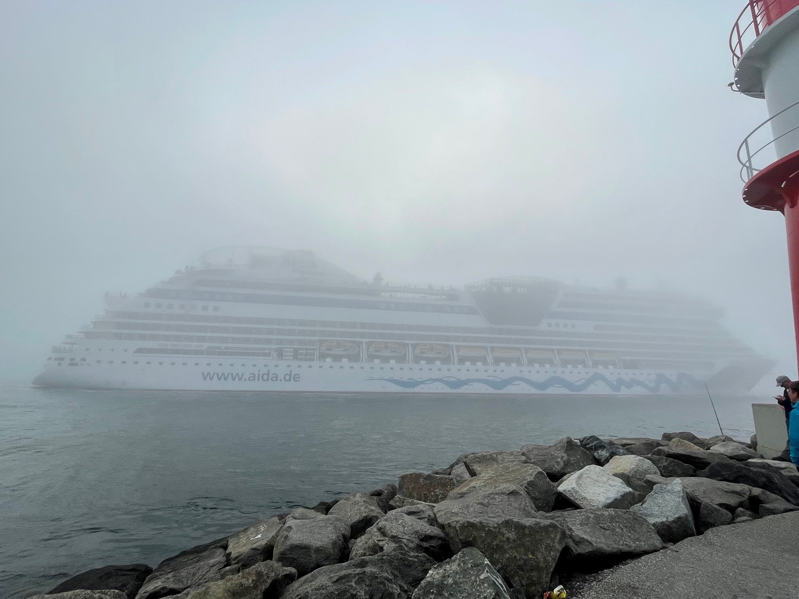 Wir wollten auch das Auslaufenvon MS4 und Diva sehen und haben lange neben der MS4 gestanden. Dabei haben wir die Ansage des Kapitäns gehört, dass man in WaMü beim Auslaufen eine Mindest-Sichtweite von 3000m haben muss und sich deshalb das Ablegen auf unbestimmte Zeit verschiebt. Danach hat sich dann der Nebel noch weiter verstärkt und plötzlich sind beide Schiffe doch gefahren.