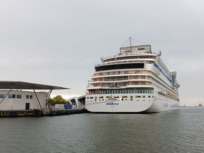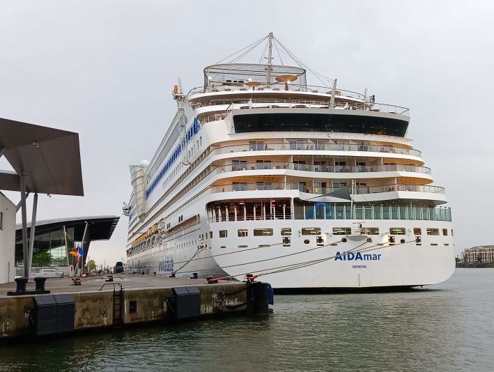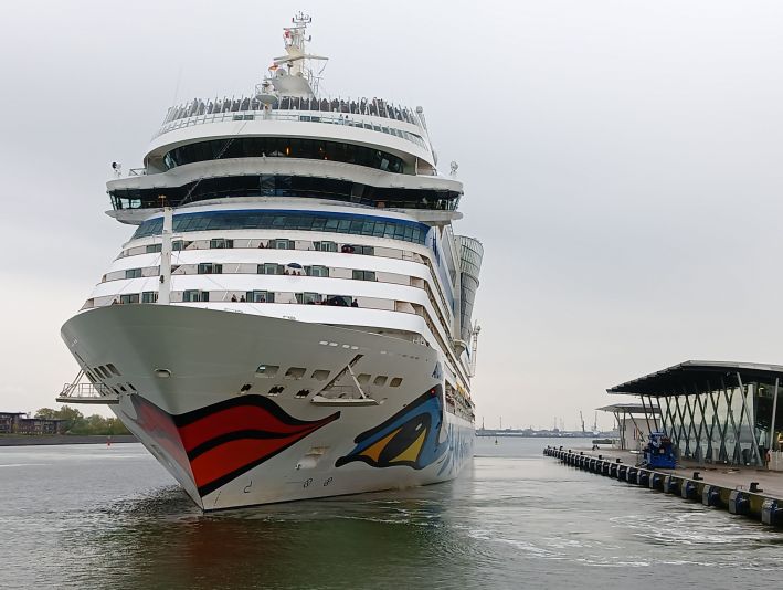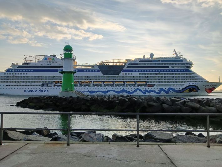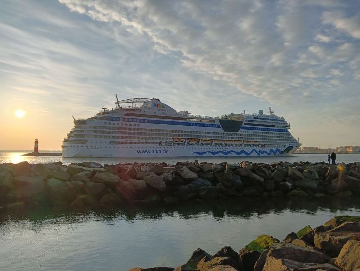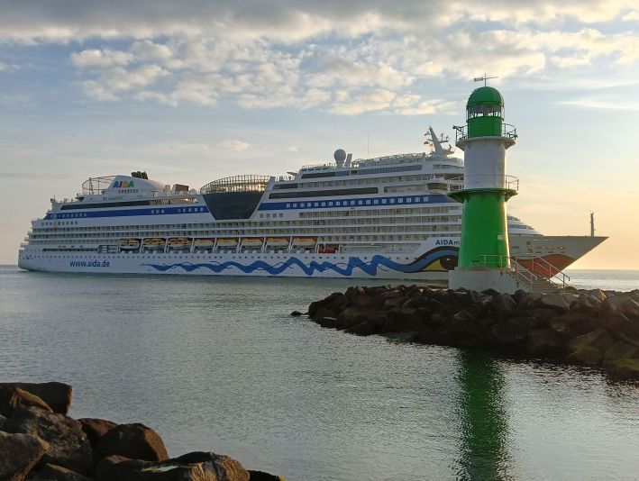 Kürzlich habe ich sie noch nur am heimischen Laptop begrüßen können, heute durfte ich sie live vor Ort in der Abendsonne von Warnemünde verabschieden: AIDAmar.