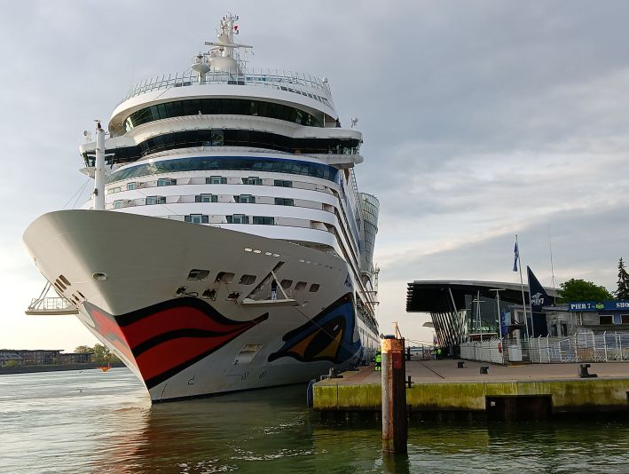 AIDAmar noch vertäut am "Pier 8" strahlt mit der Frühlingssonne um die Wette.
