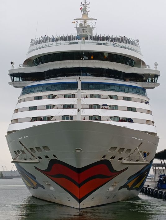 Auge in Augen mit dem schönen Kussmundschiff. So nah liegt es vor mir, dennoch ist es heute unerreichbar für mich. Ein kameraüberwachter Zaun trennt den Bereich, in dem Kreuzfahrtträume beginnen von den "See(h)leuten", wie ich es heute bin. Leider ...