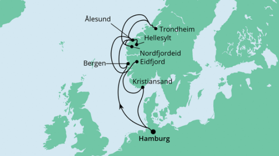 Wer mehr Wert auf Landschaft legt, dem würde ich die Norwegen- Route mit den Fjorden empfehlen, wer mehr für Kultur ist, die Ostseeroute.