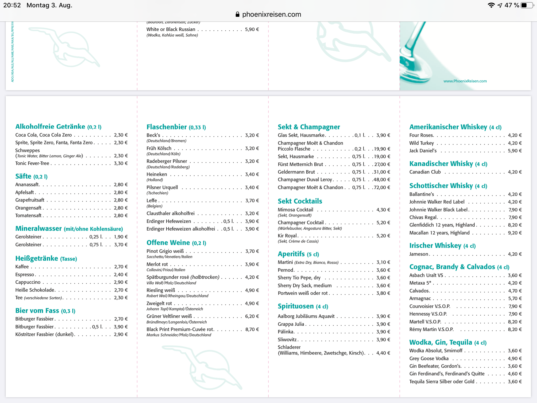 Geh mal auf die Phoenixseite und wähle unter Schiffsbeschreibungen das jeweilige Schiff aus. Dort findest Du unter Nebenkosten die Getränkekarte ;)