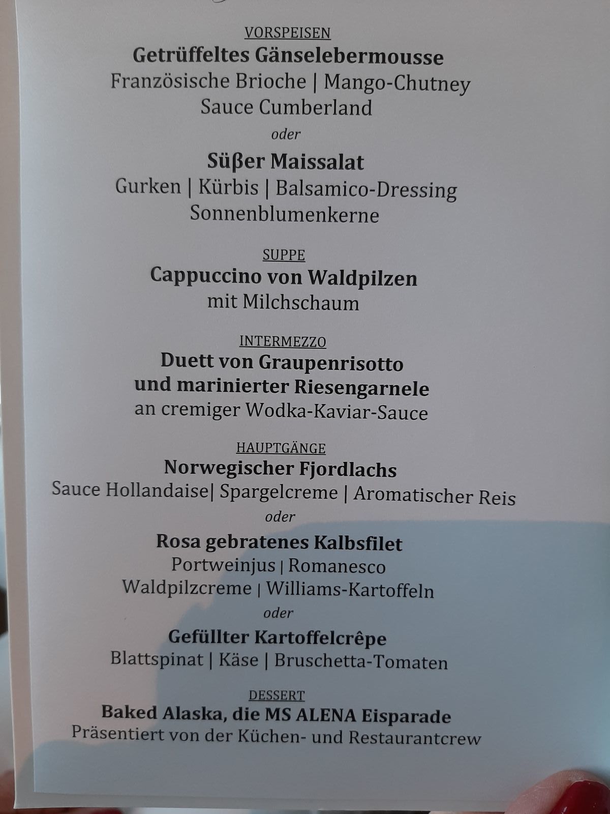 Die Kleidung beim Galabendessen war fast wie jeden Abend. Ordentliche Hose und Hemd oder schönes Poloshirt bzw. Bluse reicht völlig. Ist ja auch kein Kapitänsdinner sondern eben Gala . Vor dem Essen gab es auf dem Sonnendeck einen Sekt und ein paar Reden. Alles ganz locker und easy.