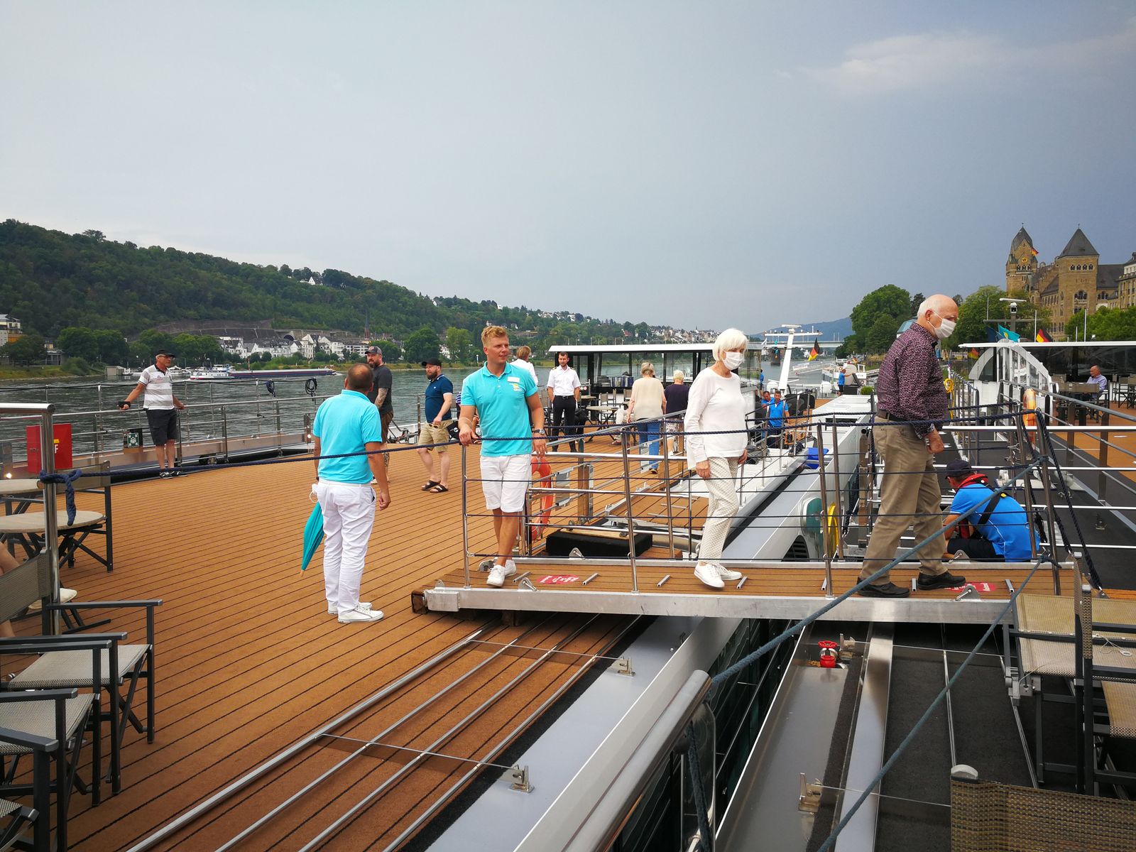 Ein Flussschiff legt immer gegen die Strömung an. Wir waren an Steuerbord, in Koblenz lagen wir in zweiter Reihe, da hatten wir Kabine des Nebenschiffes vor der Nase, war nicht so schön.