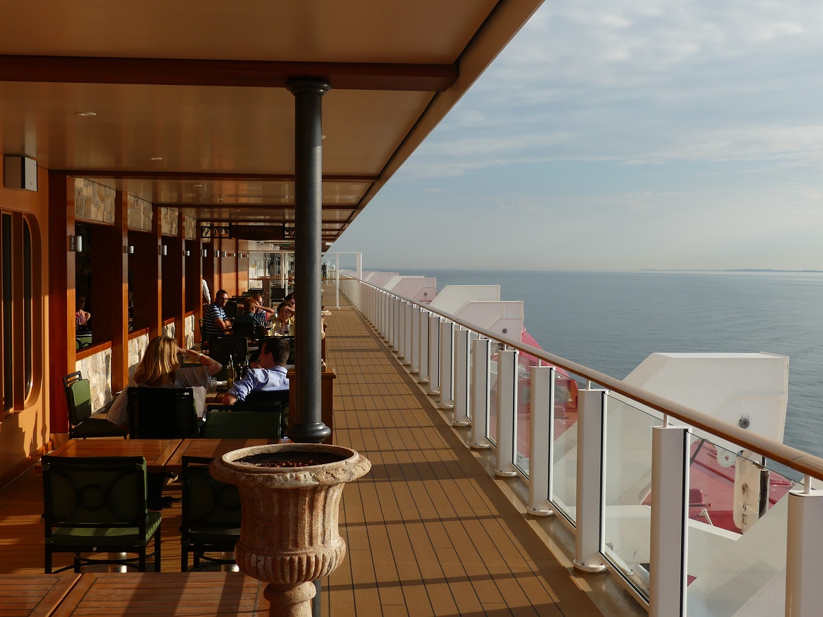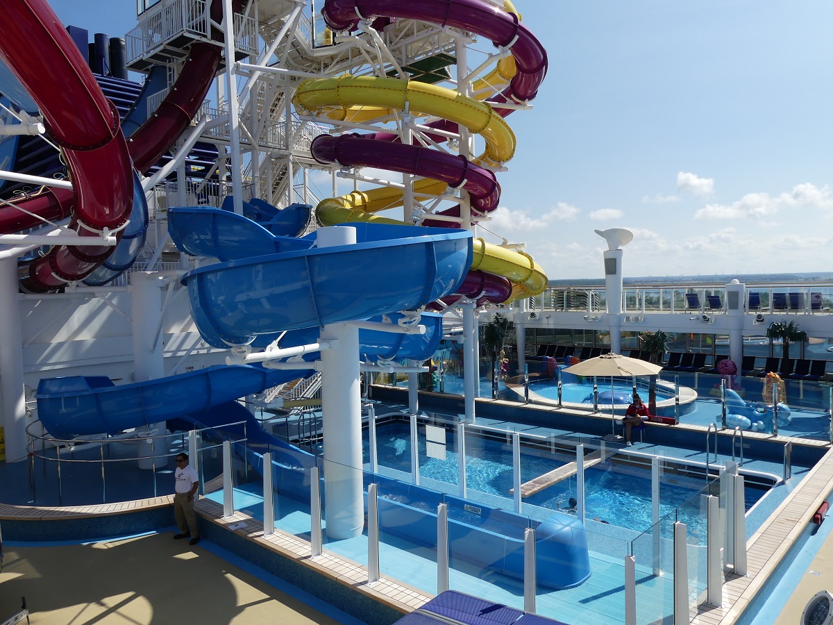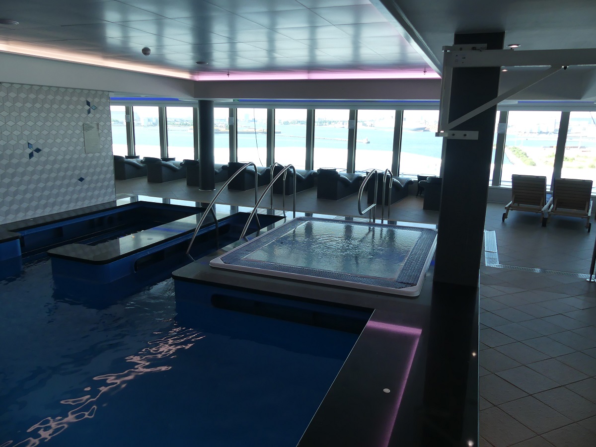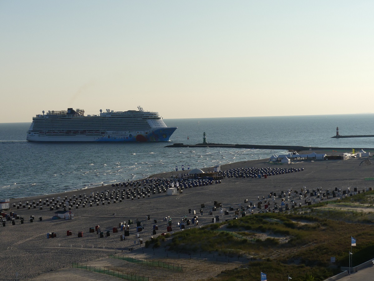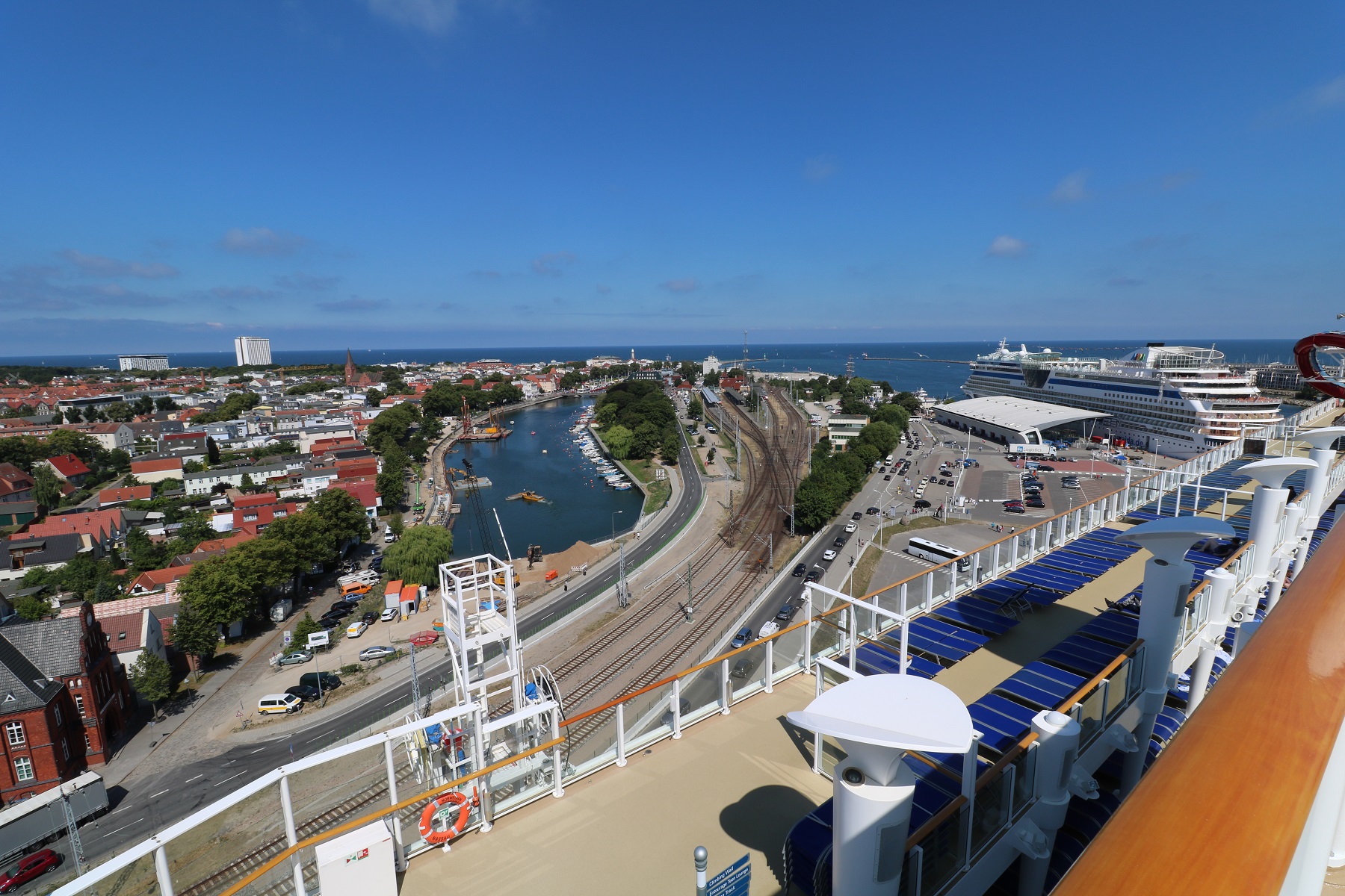 Vorübernachtung hatte ich im Neptun, ich liebe von dem Hotel den Ausblick auf Warnemünde ( immer bei Reservierung Sicht zum Hafen angegeben ). Ich habe die Einfahrt der Breakaway morgens vom Balkon angeschaut. Einschiffung war offiziell ab 12:00 Uhr möglich. Ich war 11:20 Uhr am Terminal und die Einschiffung war bereits möglich. Wartezeit gab es keine, Gesundheitsbogen ausfüllen, key Karte in Empfang nehmen und rein in das Schiff. Erstmal zum Pooldeck hoch und die Aussicht auf Warnnemünde geniesen.