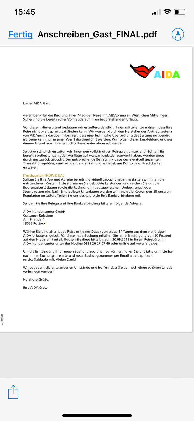 "AIDA Cruises wird den Gästen den vollständigen Reisepreis erstatten und bietet zusätzlich eine Ermäßigung von 50 Prozent (bezogen auf den Kreuzfahrtanteil) für die Buchung alternativer Reisemöglichkeiten aus unserem vielfältigen Programm an. Gäste, die sich die An- und Abreise bereits selbst organisiert haben, erstatten wir gegen Vorlage eines Beleges die entstandenen Umbuchungs- bzw. Stornierungsgebühren."