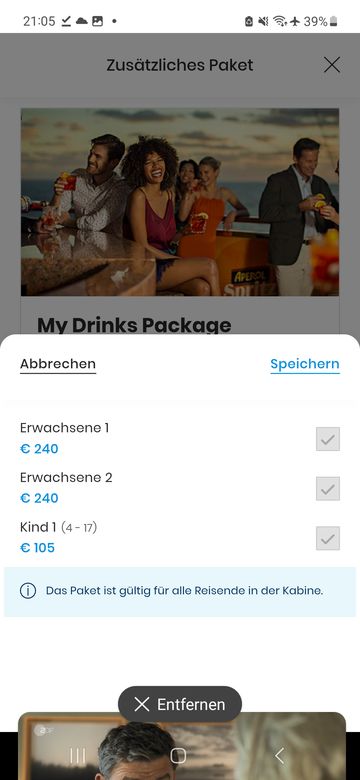Ob ein MyDrinks-Getränkepaket lohnt, müsste ihr selbst abschätzen. Ist sicher gar nicht so einfach, den Gegenwert zu vertrinken, wenn man keinen Wert auf alkoholische Getränke legt; aber es sind halt auch viele Kafffee-Spezialitäten, alkoholfreie Cocktails und Wasser mit im Paket. Wenn man den Bedarf an den kleinen Paketen für Wasser, Kaffee und Softgetränken gut absehen kann, könnte daggnatürlich preiswerter als myDrinks sein. Wenn die Wahl darauf fällt, unbedingt Pakete vorher in myCosta kaufen. An Bord gekaufte Getränkepakete kosten wegen zusätzlicher Servicepauschale mehr.