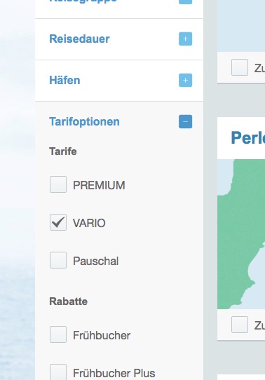 Bisher konnte man"Vario" anklicken und bekam, nach Datum sortiert, alle Reisen angezeigt, die im Vario-Tarif zu buchen sind. Alle Vario-Reisen aktuell bis März oder April. Es waren alle Kabinenkategorien mit Preis ohne Flug aufgelistet und daneben die Preise für alle Kabinenkategorien mit Flug. Wenn man also keine bestimmte Reise im Auge hatte, konnte man auf einen Blick sehen, welche Reisen und Kabinenkategorien in dem Zeitraum der infrage kam zur Verfügung stehen. Ebenso ob es mit oder ohne Flugangebot zu buchen war Und das alles auf einen Blick mit den genauen Preisen.