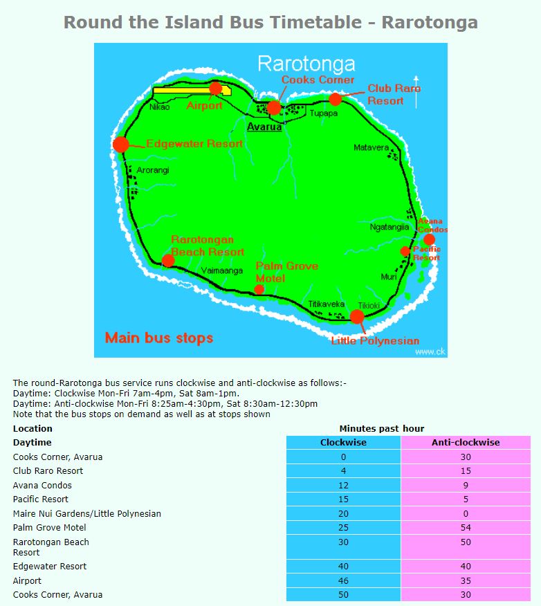 Bus Timetable for Rarotonga, Cook Islands