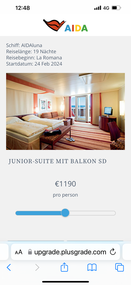 Mein Mann hätte allerdings gerne eine Verandakabine und im Rahmen des Bieterverfahrens wäre es mir jetzt möglich, auf eine Verandakabine Komfort zu buchen, Startgebot 60€ pro Gast.