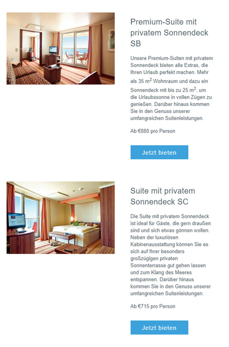 Deshalb testen sie auch aktuell die Aktion "Upgrade Kabine gegen Gebot" so rund um die 60 Tage vor Reisebeginn.
