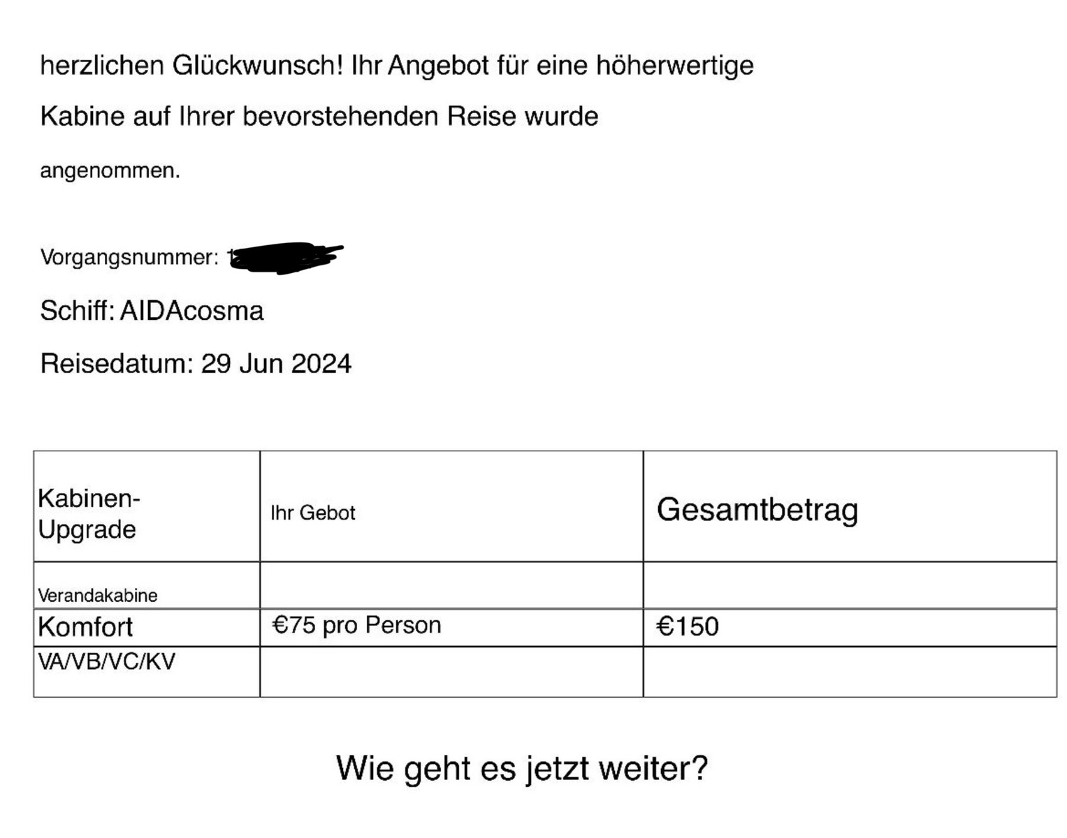 Bisher habe ich weder eine email für ein Bieterverfahren erhalten, noch könnte ich die Reise in MyAida upsellen oder upgraden.