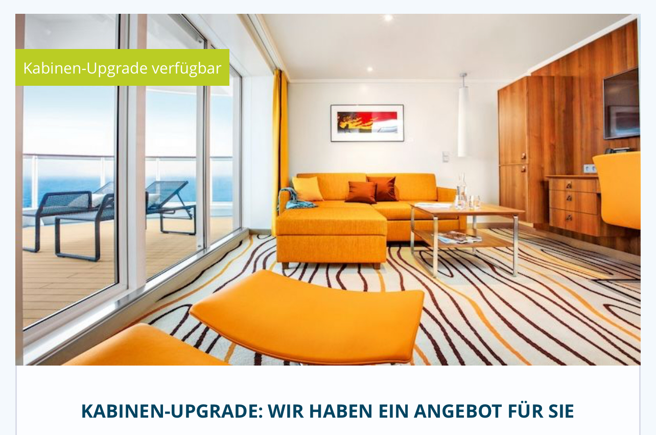Heute war bei uns ein Upgrade Angebot für eine Kurzreise mit der Luna auf MyAida. 17 Tage vor Anreise von Balkon auf eine Deluxe Suite SA für 3 Personen für € 498. Der reguläre Preis wäre bei der Premium Buchung € 3.535 gewesen. Unsere Balkonkabine hatte bei Premium Buchung € 1.755 gekostet. Ersparnis sind € 1.282. Wir haben das Angebot angenommen 😃