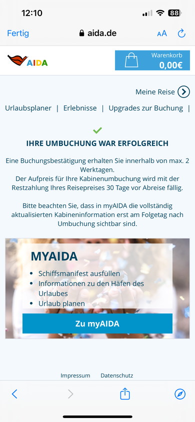 Heute, 14 Tage vor Start unserer Kurzreise (3 Tage) mit AIDAmar gab es bei uns auch ein Kabinenupgrade-Angebot unter myAIDA.