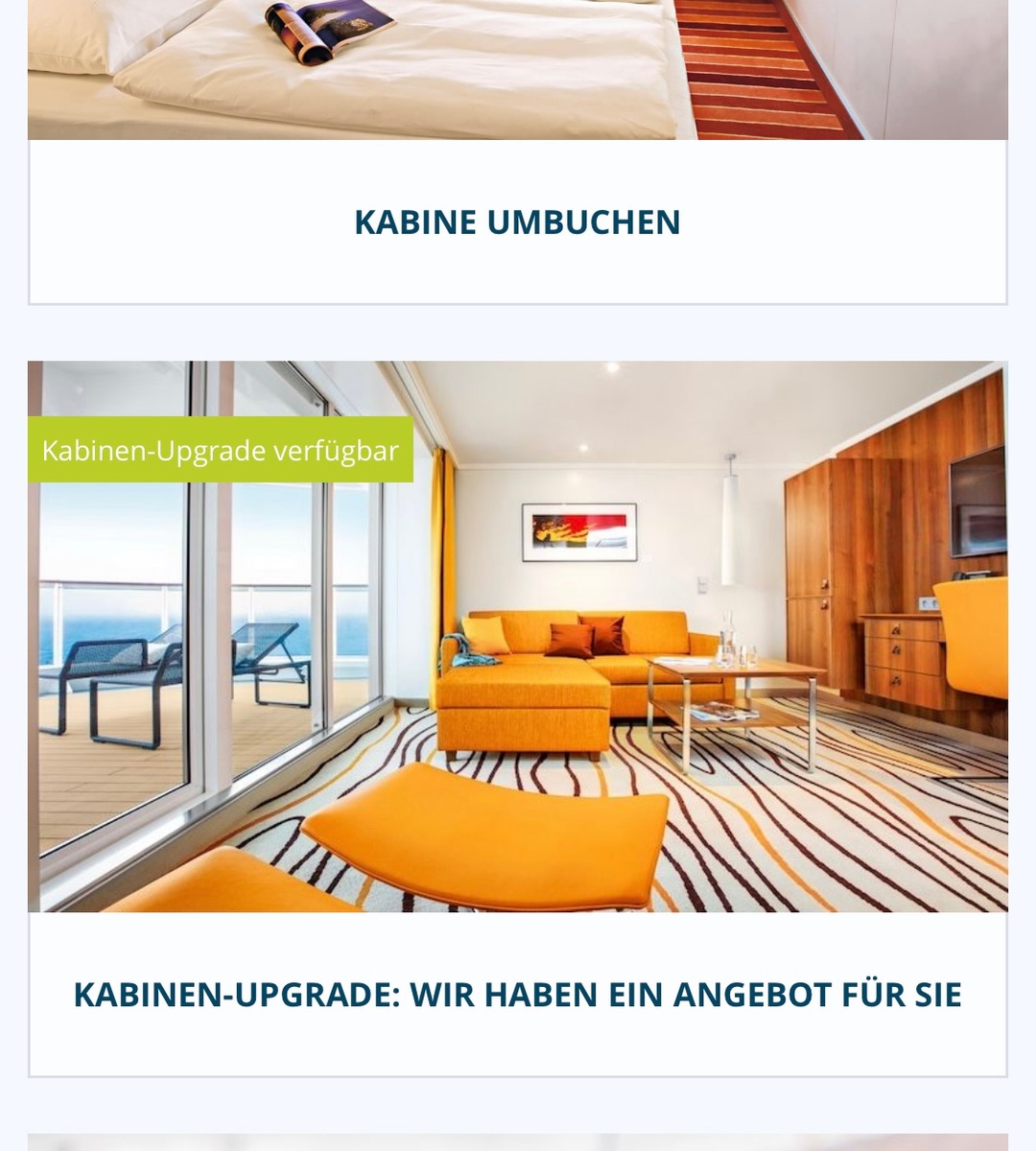 Das steht bei uns unter dem Reiter Upgrades zur Buchung mit der Bezeichnung Kabine umbuchen