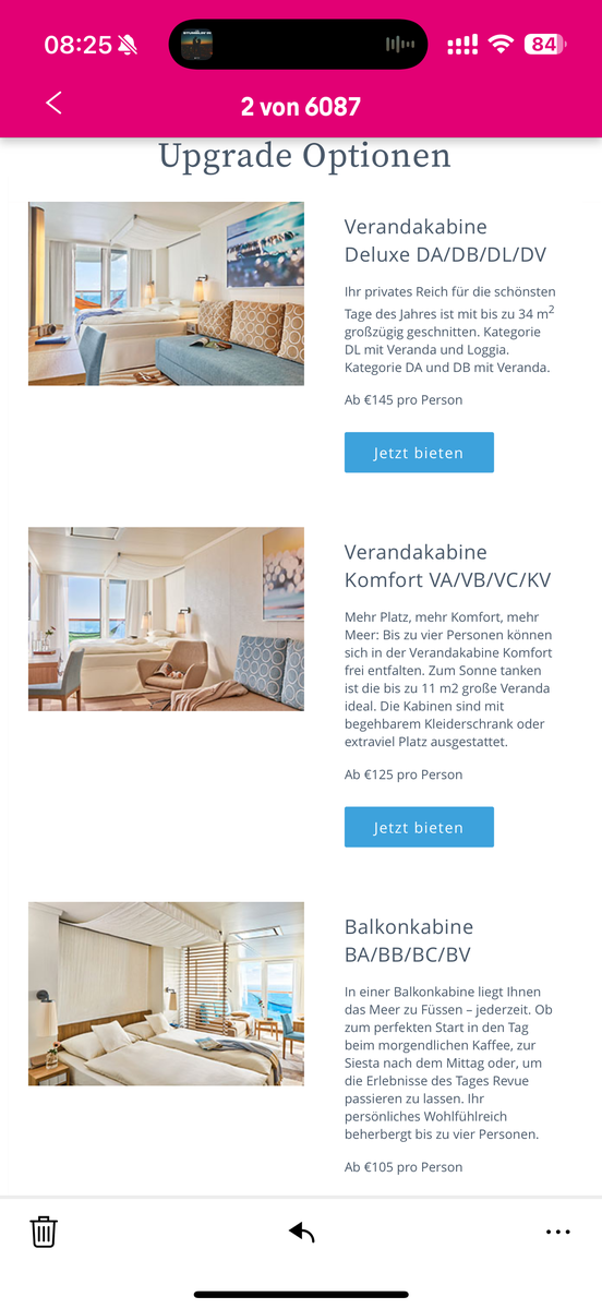 Ich hatte die Bietetmail auch erst 1x. Das war bei der Transreise von Barbados nach Hamburg im März. Die Reise hatte ich kurzfristig drei Wochen vorher gebucht, drei Tage nach der Buchung kam die Mail.