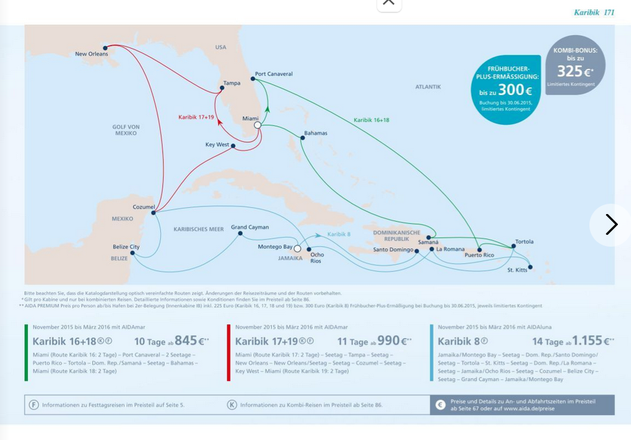 Was aber zumindest mal geplant war: Erinnert sich noch jemand, dass im zweiten Winter dieser 10/11-Tage-Reisen ursprünglich die Mar diese Touren übernehmen sollte (gab auch schon Kataloge damit). Ist dann anders gekommen: Es wurde dann doch wieder die Vita (die, wenn ich mich recht erinnere, in der ersten Katalogfassung das Rote Meer befahren sollte) und die Mar wurde erstmals auf der 14-tägigen Karibik/Mittelamerika-Tour eingesetzt. Als es aber noch die Mar werden sollte, gab es für beide Touren (10 und 11 Tage) jeweils zwei Wechseltage: Die in jeder Tour geplanten zwei Miami-Tage waren beide als Starttag möglich. Eine Variante startete mit dem Miami-Overnight, die andere (Check-in einen Tag später) endete dementsprechend mit einem Miami-Overnight. Leider habe ich den Katalog von damals nicht mehr. Ich bin mir aber hundertprozentig sicher...