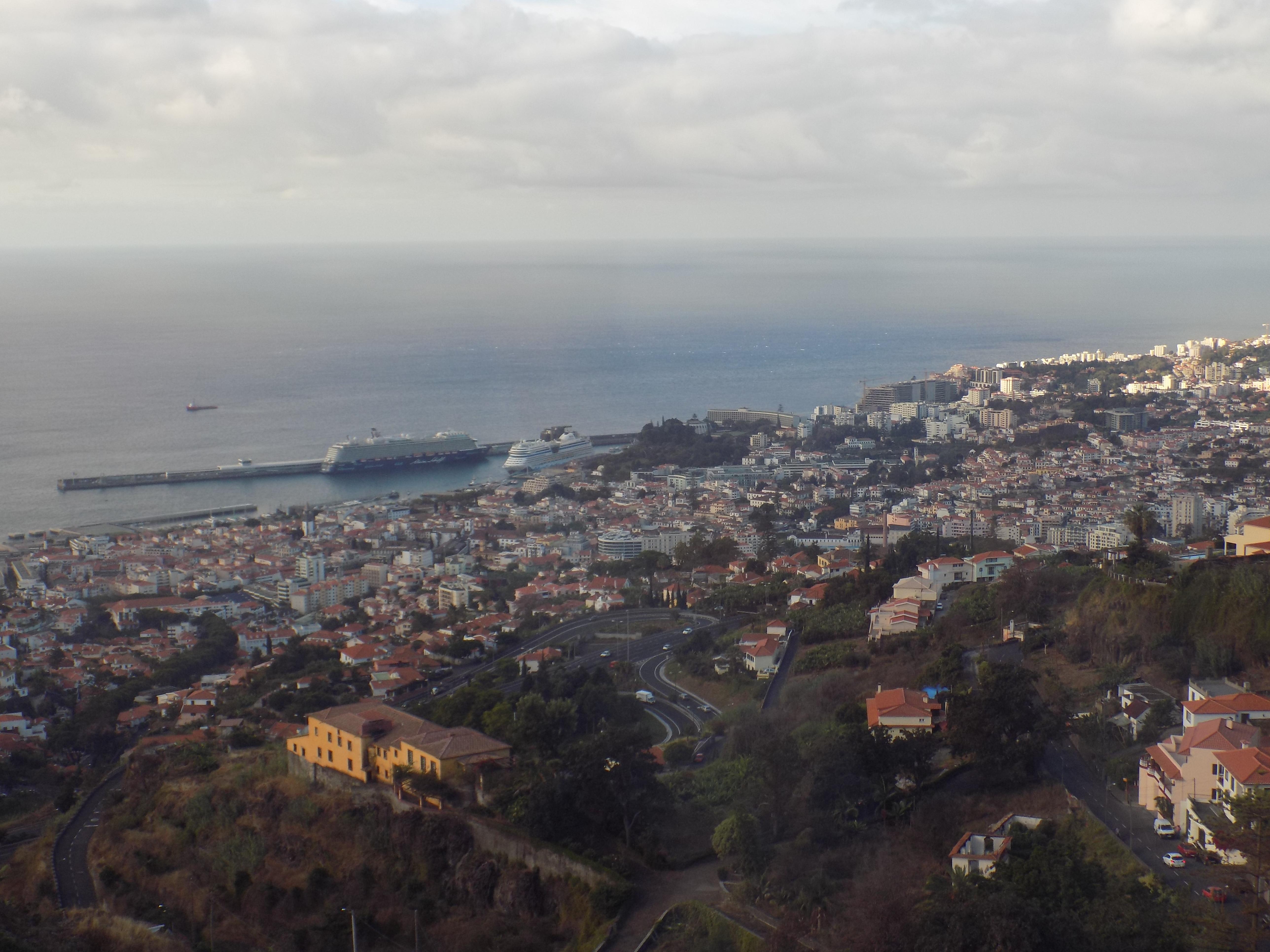 Unser Plan war es nach dem Frühstück auf eigene Faust die Stadt zu erkunden. Nach dem wieder mal leckeren Frühstück im Buffetrestaurant, machten wir uns auf zu Fuß Richtung Seilbahnstation. Nach ca. 25 Minuten Fußweg sind wir dort angekommen. Die Seilbahnstation war leicht zu finden und der Weg dort hin ging schön an der Promenade entlang. Für 11€ haben wir ein Ticket genommen welches uns nur hoch zum Berg Monte bringen sollte. Dort angekommen hat man einen sensationellen Ausblick über ganz Funchal, den Hafen und das Meer. Hier genossen wir die Ausblicke und besichtigten noch eine Kirche.