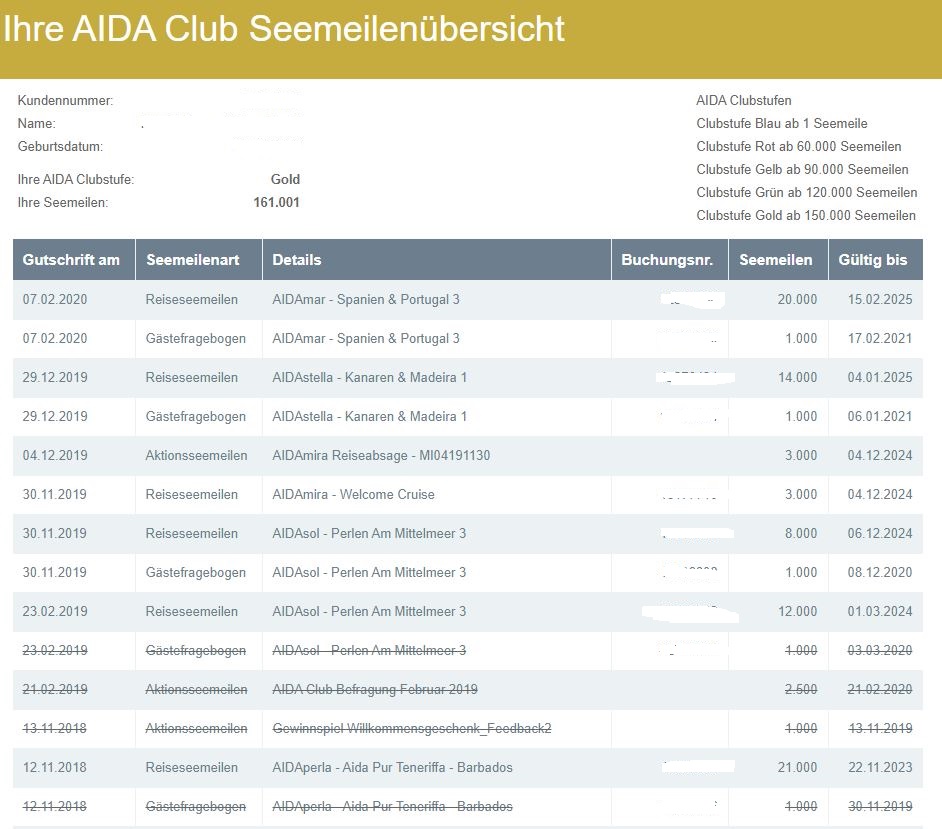 Seit Februar 2020 steht in meinem Aida Club welche Reisen wann mit welchen Seemeilen noch bis wann gültig sind, ist das bei euch auch so ?