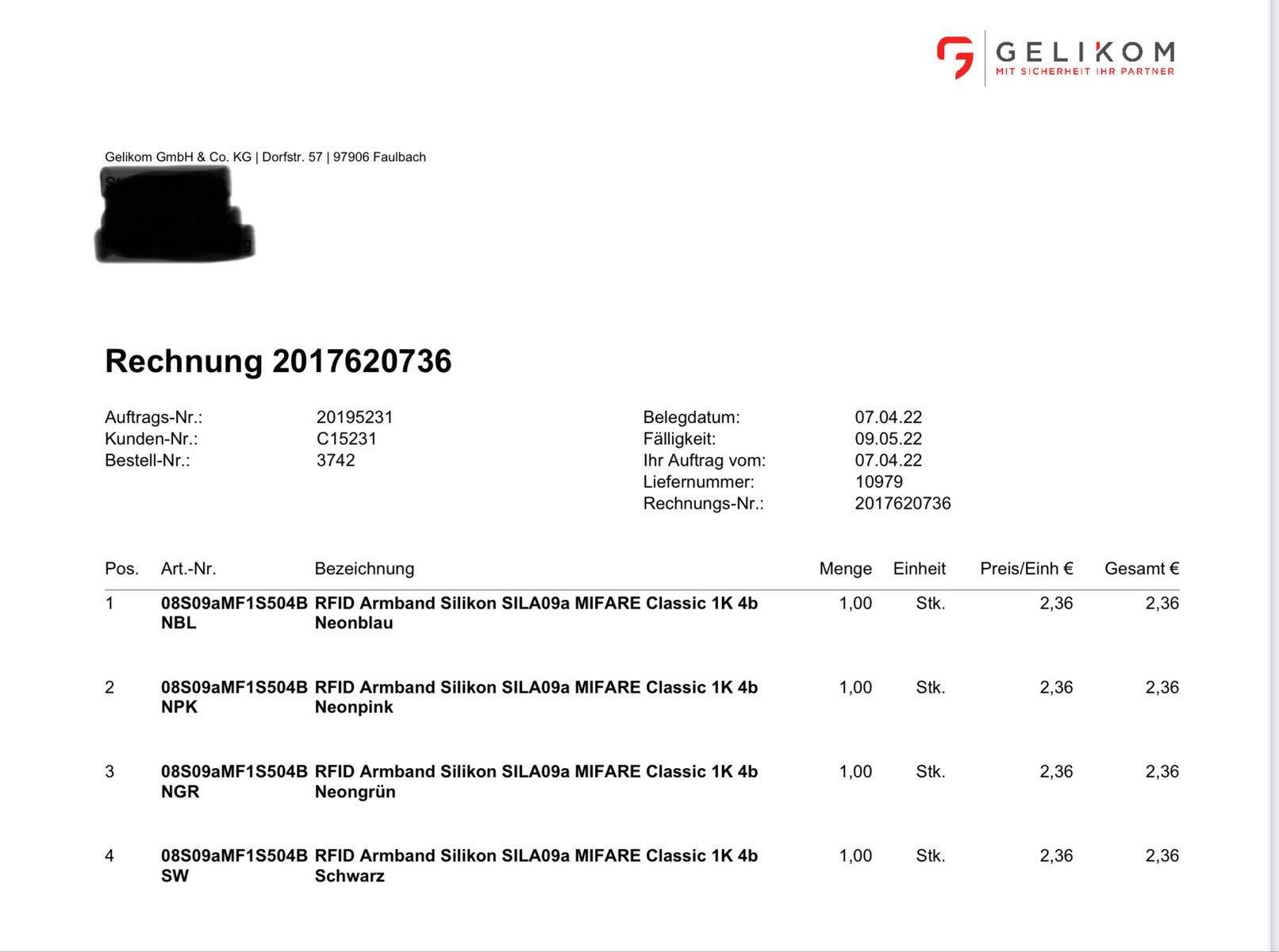 Es handelt sich also um ein Band mit einem MIFARE CLASSIC 1K Chip mit 4 Byte UID.