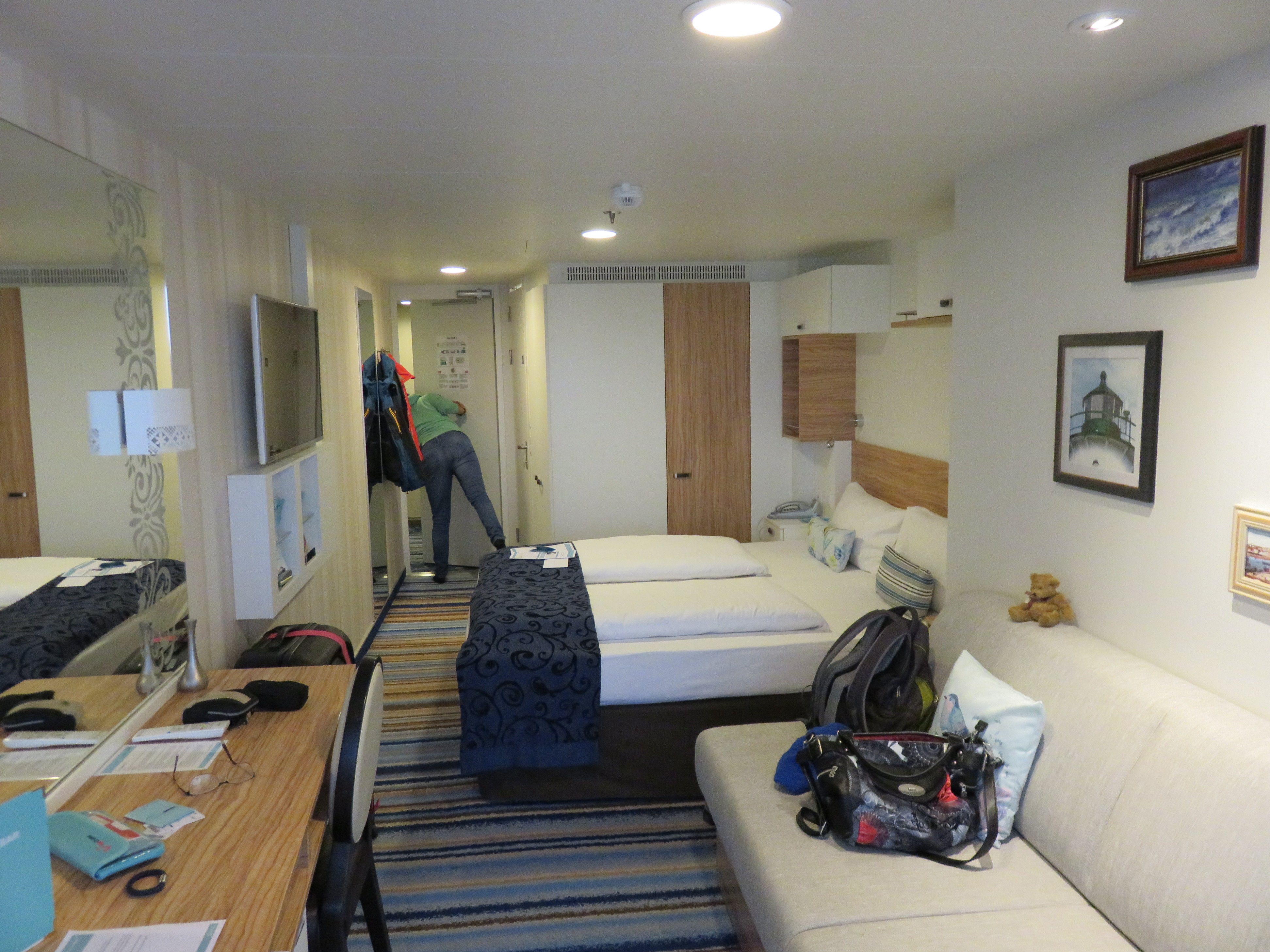 Ich würde auf keinen Fall wieder eine Kabine nehmen, wo man mit dem Kopf im Bett an der Wand zum Flur liegt und die Füße Richtung Meer zeigen.