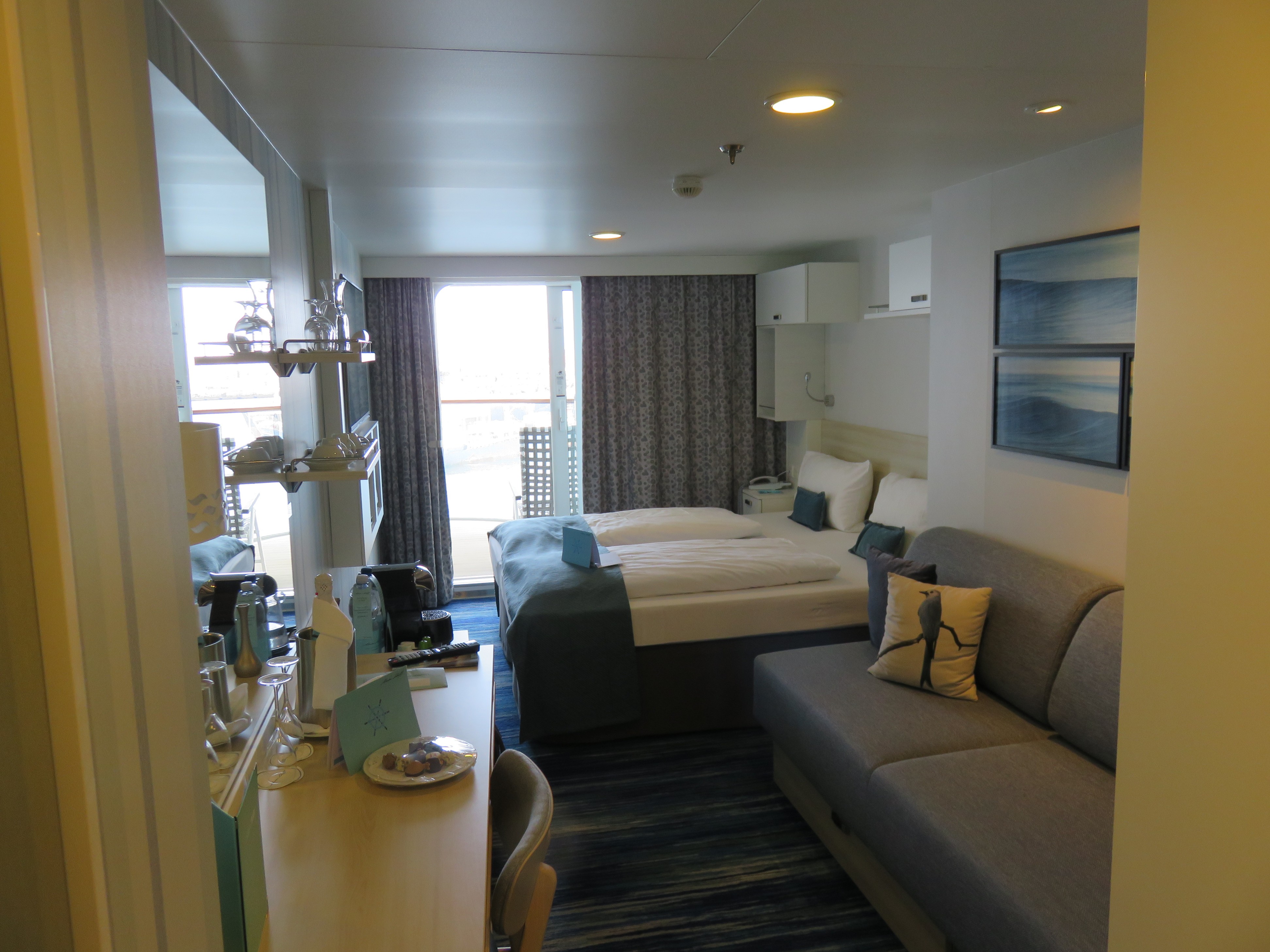Balkonkabine auf der Nova, da war unser Bett auch am Fenster und wir hatten das Bett in Fahrtrichtung.