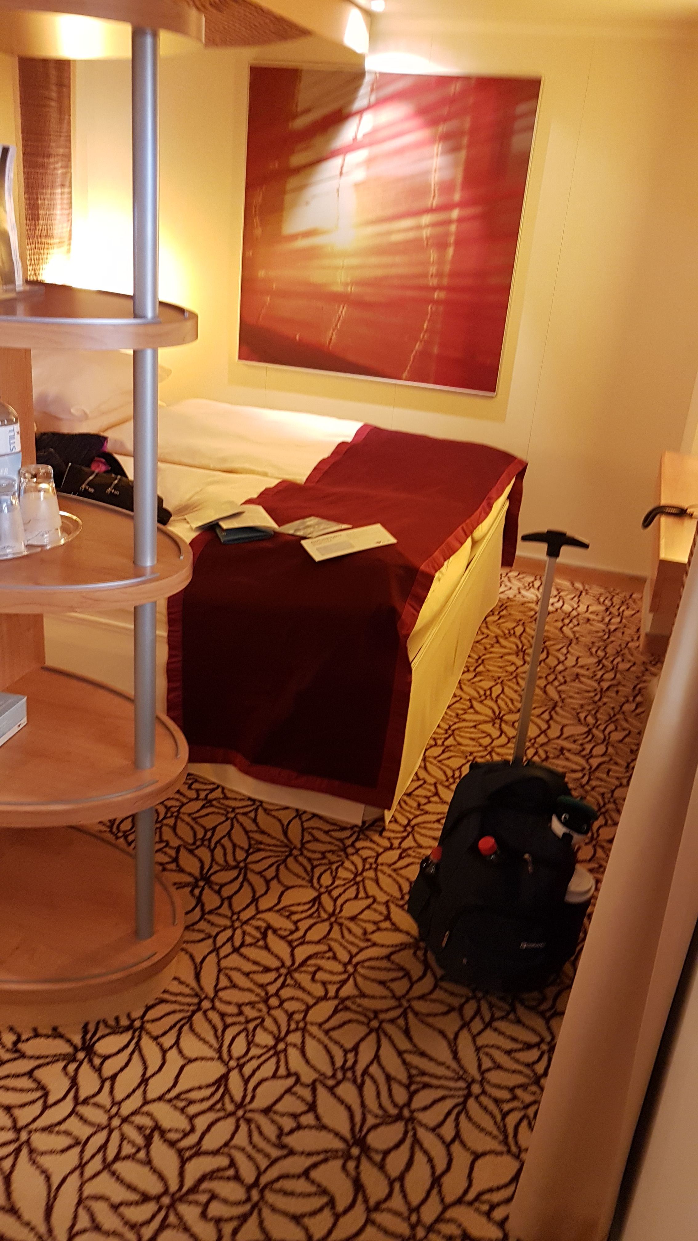Man kommt rein und guckt geradeaus aufs Fenster und sieht das Meer und die Sonne. Naja, nicht so ganz, es ist ein Tenderboot dazwischen, aber man kann genau durch die Fenster des Bootes gucken. Konnte immer ganz gut raus gucken, so manchen Sonnenaufgang und Hafeneinfahrt gesehen bevor ich an Deck gegangen bin. Auch der Schrank als Raumteiler ist gut und das Doppelbett dahinter, wie in einer Schlafkoje ;).