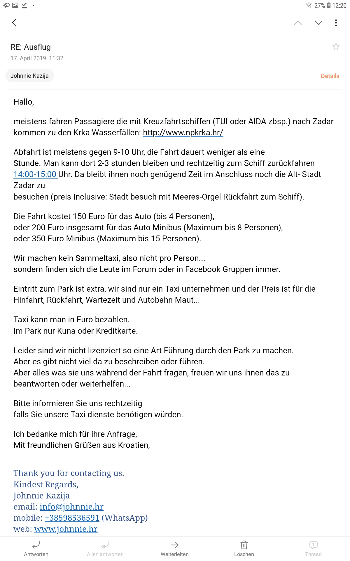 Wir haben vor in Zadar entweder mit Johnny oder Adriatic Taxi eine Tagestour zu den Krka-Wasserfällen und in die Altstadt zu machen.