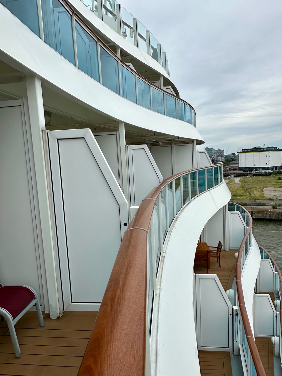 Die Veranda ist schön groß, der vordere Teil ist einsehbar von oben (ähnlich wie auf den Balkonkabinen von Deck 6 auf den Sphinxen).