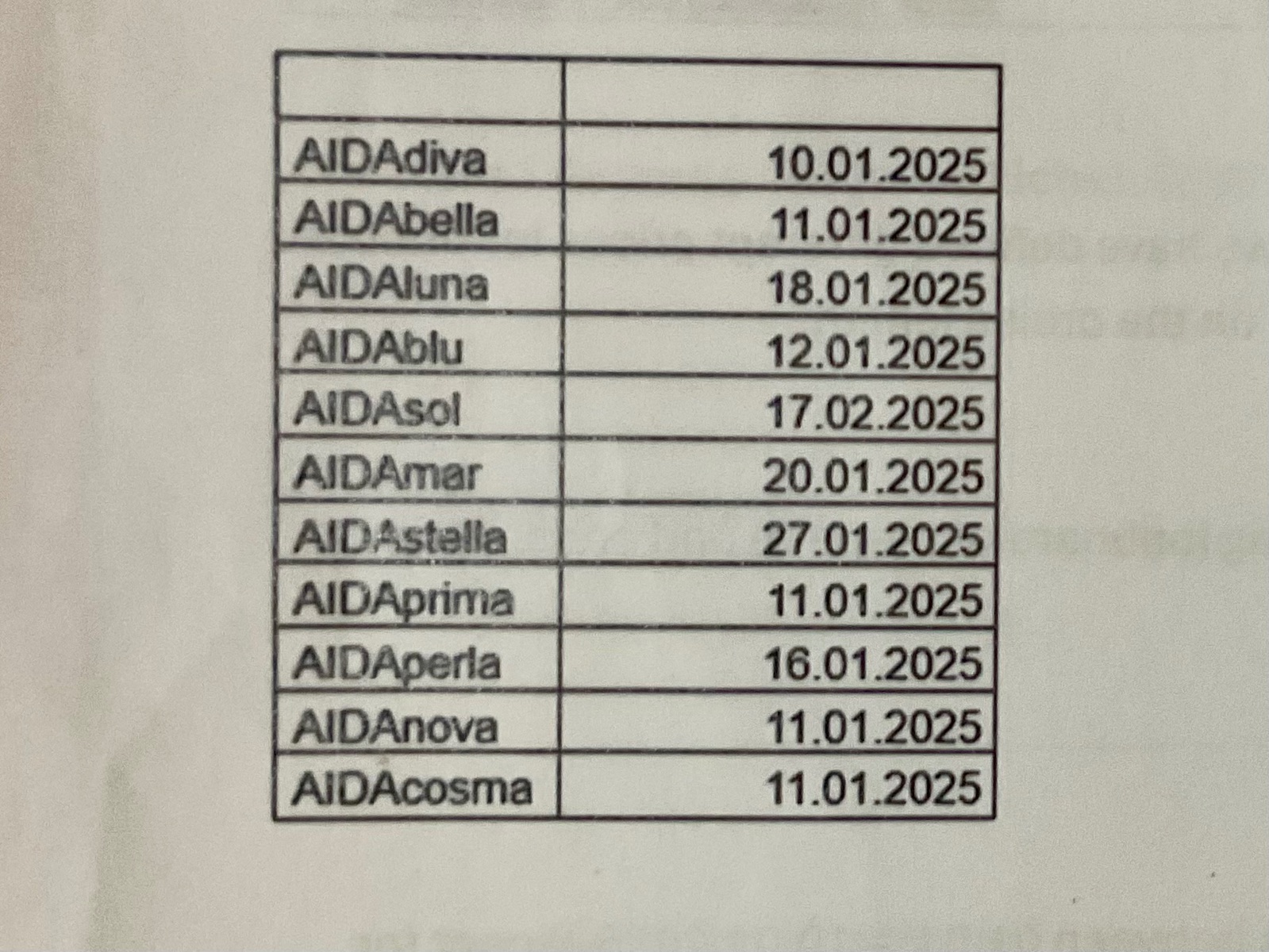 1 x AIDA , 5 x AIDAcara , 6 x AIDAvita , 5 x AIDAaura , 1 x A'ROSA Blu , 0 x AIDAblu (alt)