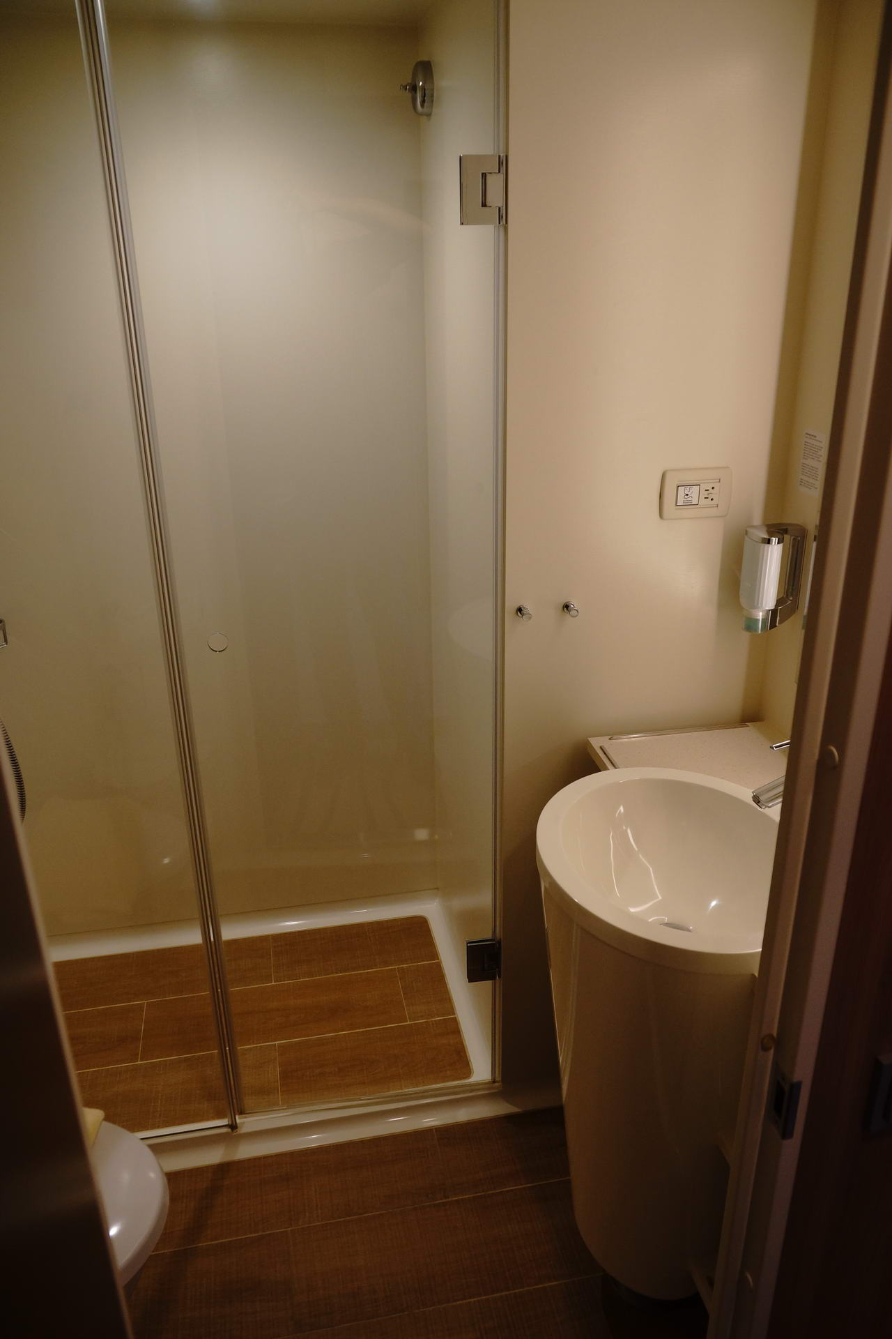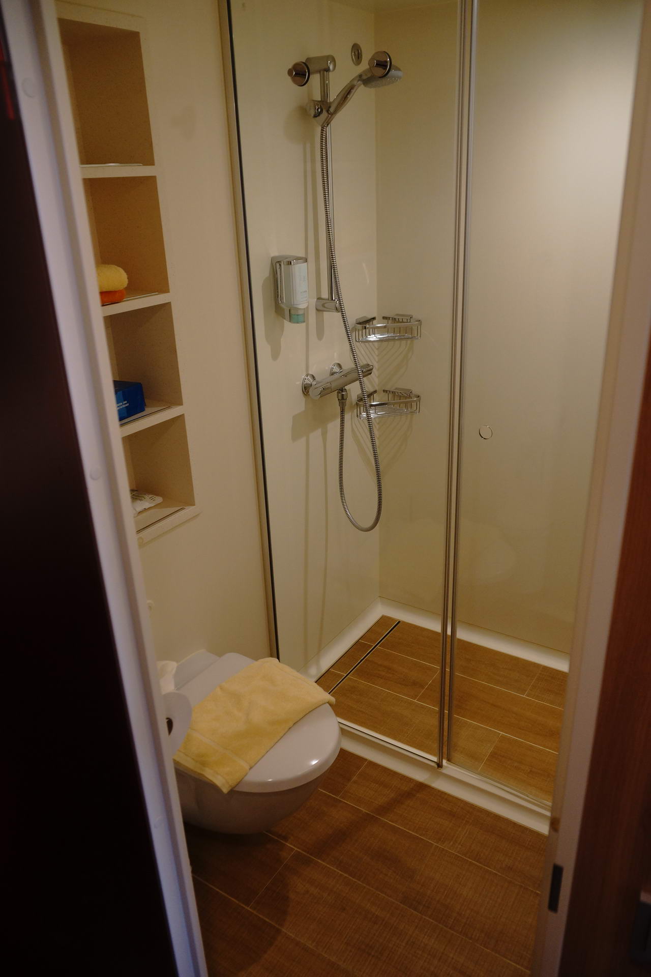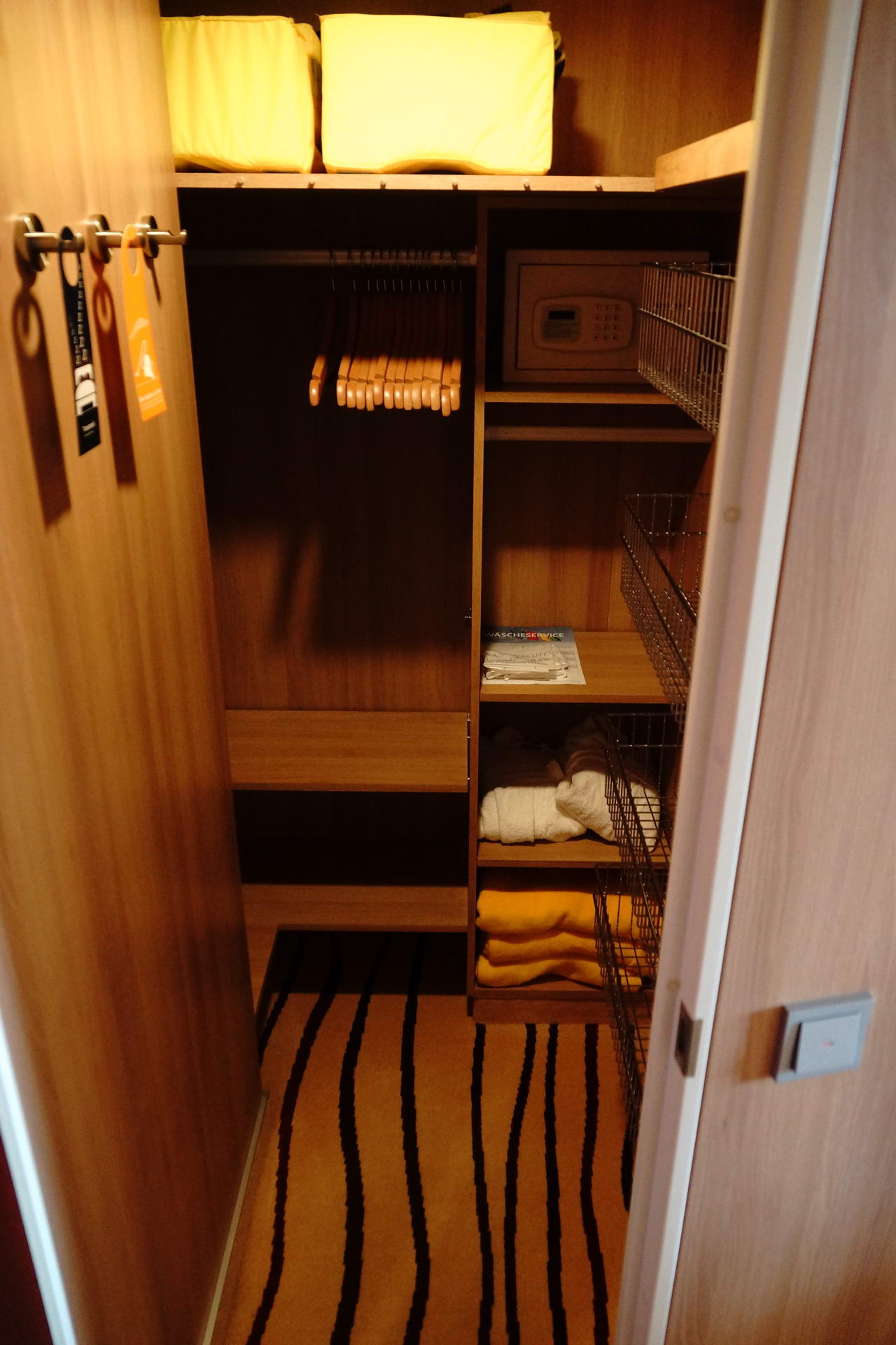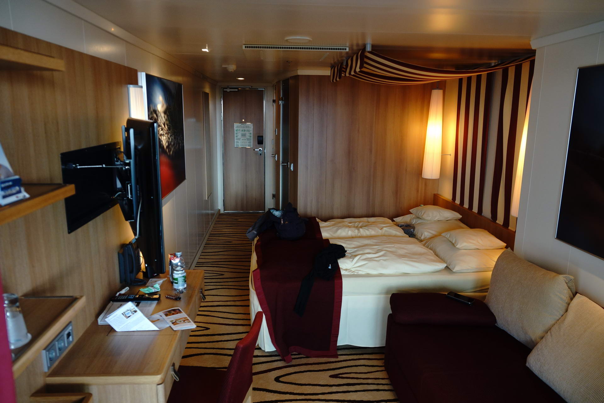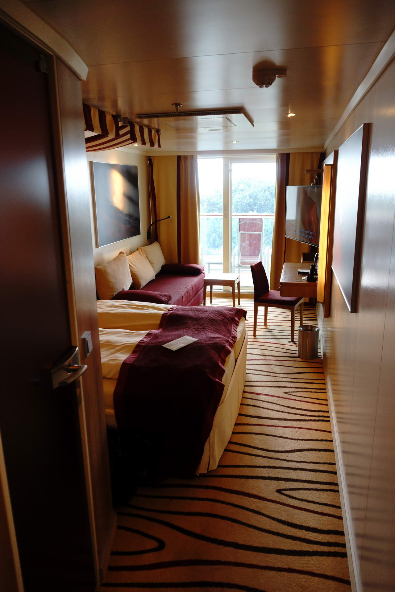 Der Kleiderschrank nervt mit seiner schweren Tür, die immer zufallen will. Habe mir zweimal sehr den Kopf darin gestossen und war wohl nicht der erste, denn die Kantenabdeckung war schon weg und lag neben den Rettungswesten. Vom Balkon kann man gut auf den Außenbereich des Spa-Bereich von Deck 8 sehen und das Rauschen der Whirlpools stört auch ein wenig.