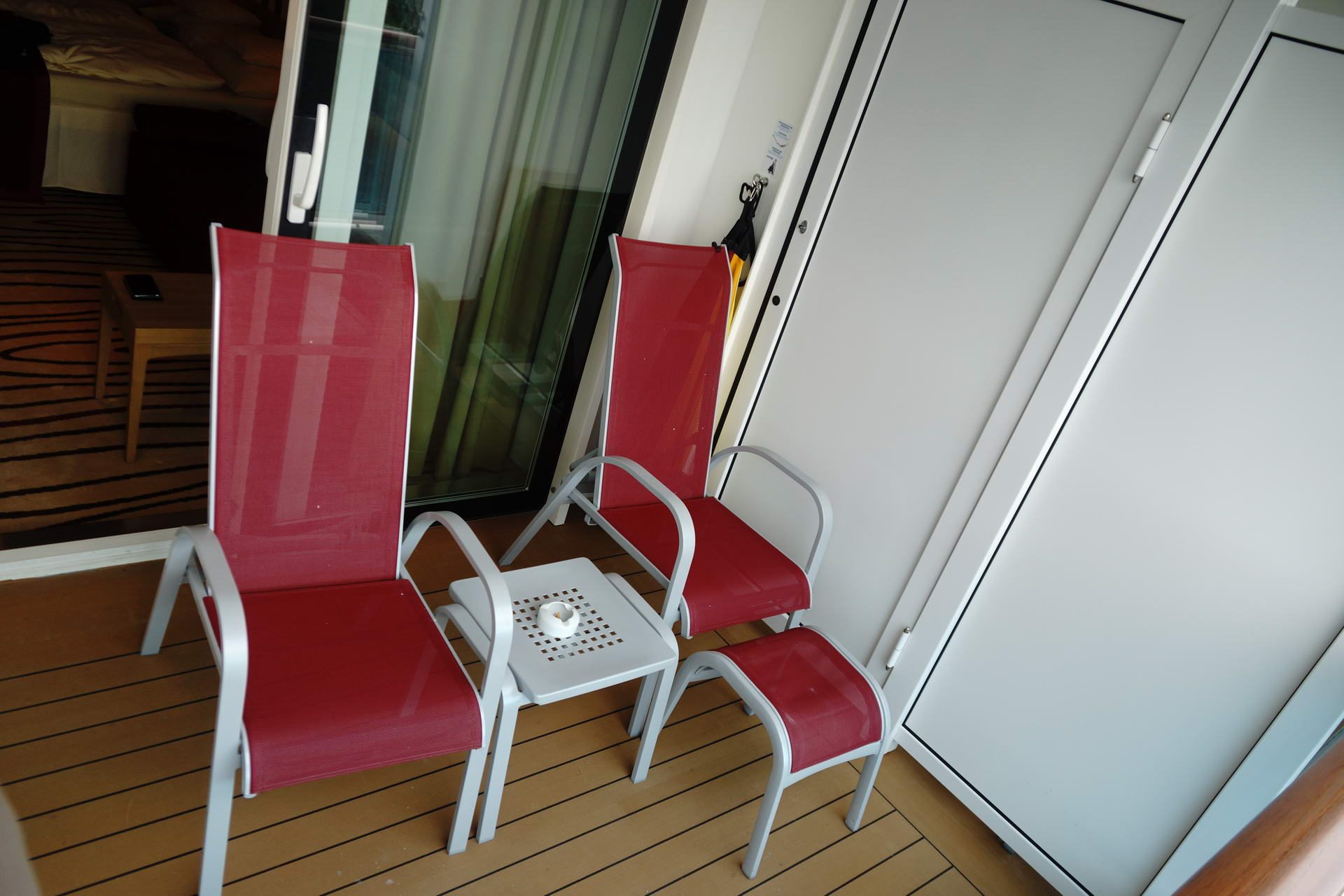 Verandakabine mit begehbarem Kleiderschrank und dem normal kleinen Balkon (ca. 4qm). Der Balkon hat 2 Stühle, die man zum Liegen auch flach umklappen kann. Ein Fußschemel und ein Tischchen mit Aschenbecher sind dabei, eine Hängematte ebenfalls, die man quer über den Balkon aufhängen kann. Die Hängematte ist sehr stabil, aber nur für eine Person geeignet.