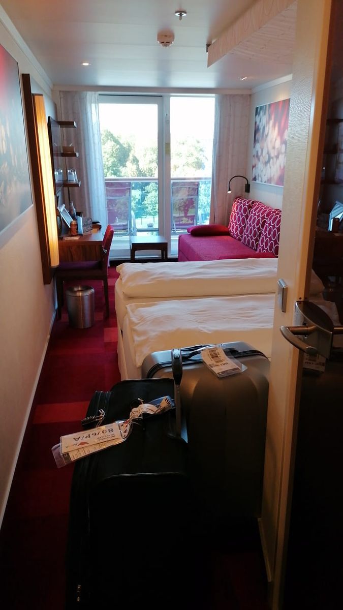 Normale Balkonkabine mit begehbarem Kleiderschrank. Am Fenster ist die Couch. Damit ist zwischen Bett und Wand (zum Schrank) 40 cm Platz. Wer diese Seite gezogen hat, muss damit rechnen, mit der Wand Bekanntschaft zu machen.