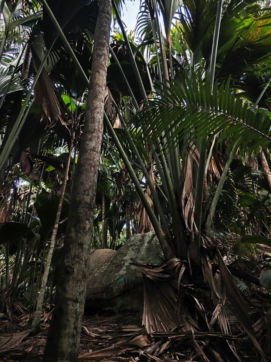 Es ging weiter zum Strand. Beim Strand durften wir 50 min bleiben -ebenfalls viel zu kurz. Es war ein extrem schöner Strand und hätte noch zum verweilen gelockt. Man ist hier dann doch eher gestresst. Das Wasser war angenehm warm und es war eine tolle Kulisse mit Felsformationen. Leider waren die 50 min. schnell um und wir sind weiter zu einem Hotel gefahren, dort wartete unser Mittagsbuffet. Die Aussicht war sehr schön. Nach dem Mittagessen ging es weiter in den Wald des Naturschutzgebietes mit der berühmten Coco de Mer Palme. Hier wurde "zu" ausführlich erklärt.