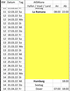 Was ist denn für AIDAvita zwischen dem 17.03.22 und dem 31.03.22 vorgesehen?