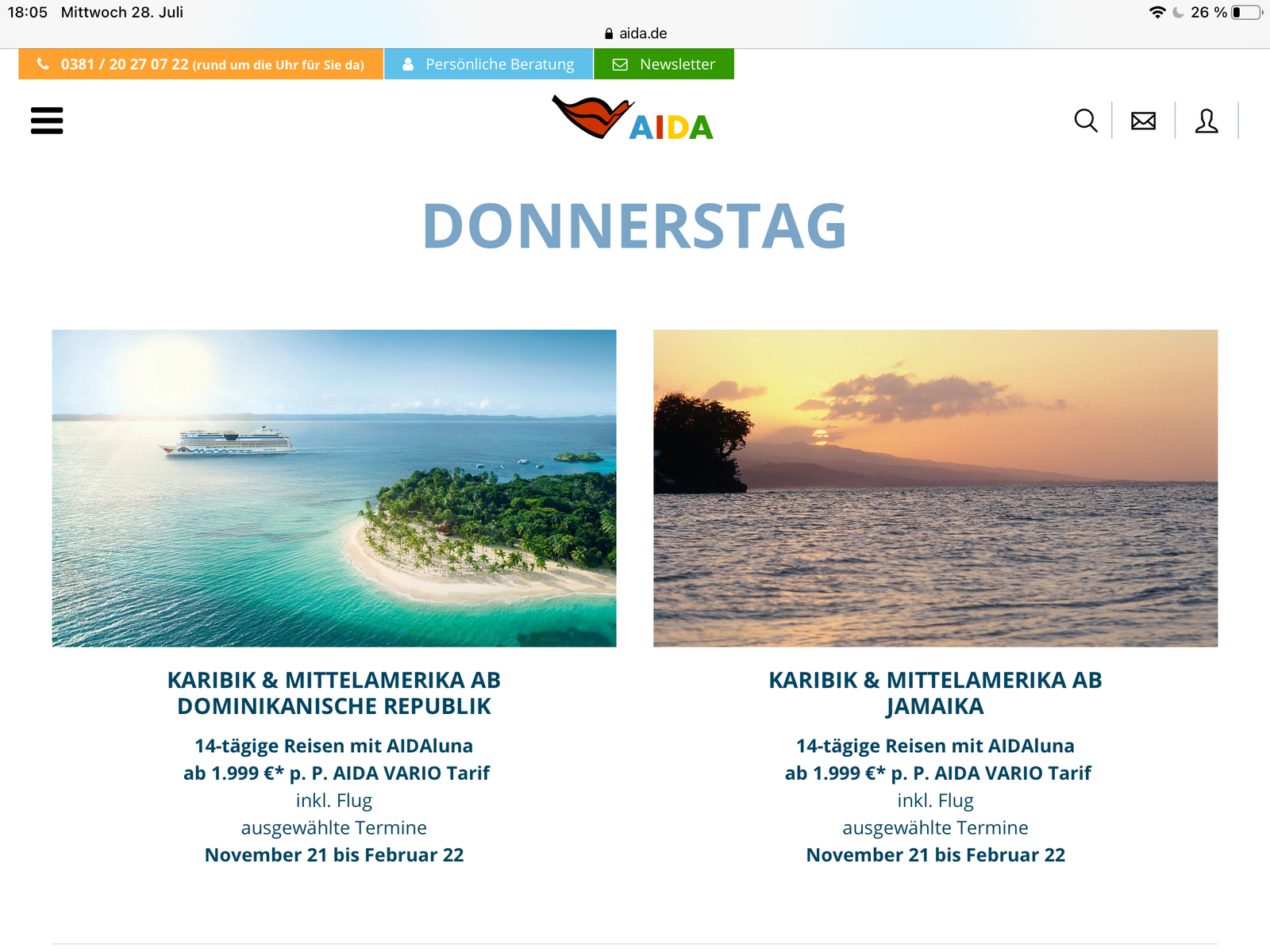 • 26.10.2021 – 21.11.2021: Von Warnemünde nach Jamaika mit AIDAdiva ab EUR 1.999,00 pro Person inkl. Rückflug