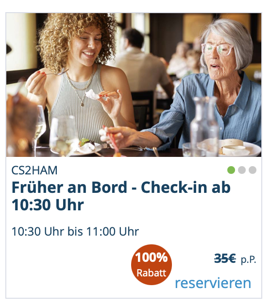 Wir buchen aber tatsächlich den Early Check In hauptsächlich, um Oma das Warten in der Schlange zu ersparen. Und wir müssen eh um 10:00 Uhr aus dem Vorübernachtungshotel raus sein, da bietet sich der auch aus dem Grunde an, dass wir dann nicht noch mit Gepäck und gesammelter Mannschaft ein paar Stunden totschlagen müssen.