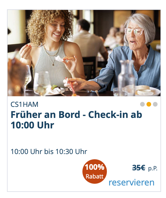 Wir buchen aber tatsächlich den Early Check In hauptsächlich, um Oma das Warten in der Schlange zu ersparen. Und wir müssen eh um 10:00 Uhr aus dem Vorübernachtungshotel raus sein, da bietet sich der auch aus dem Grunde an, dass wir dann nicht noch mit Gepäck und gesammelter Mannschaft ein paar Stunden totschlagen müssen.