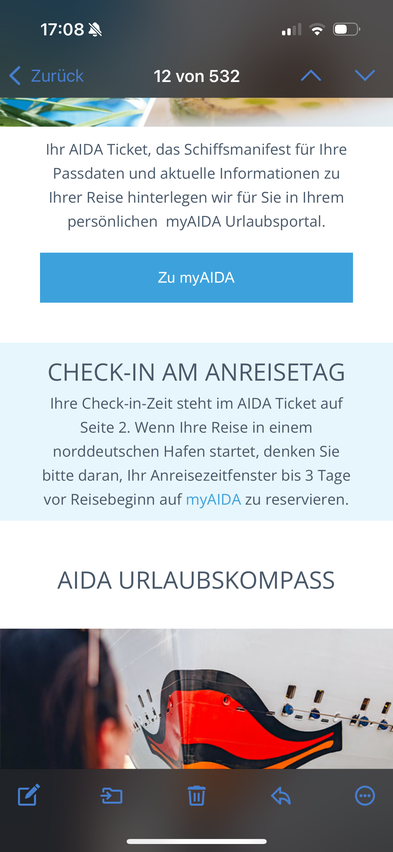 Im Anhang senden wir Ihnen Ihren myAIDA Reiseplan. Darin finden Sie all die schönen und auch praktischen Dinge, auf die Sie sich in Ihrem Traumurlaub freuen können. Diesen Plan sollten Sie auf Ihrer Reise dabei haben – ausgedruckt oder digital auf Ihrem Smartphone oder Tablet."