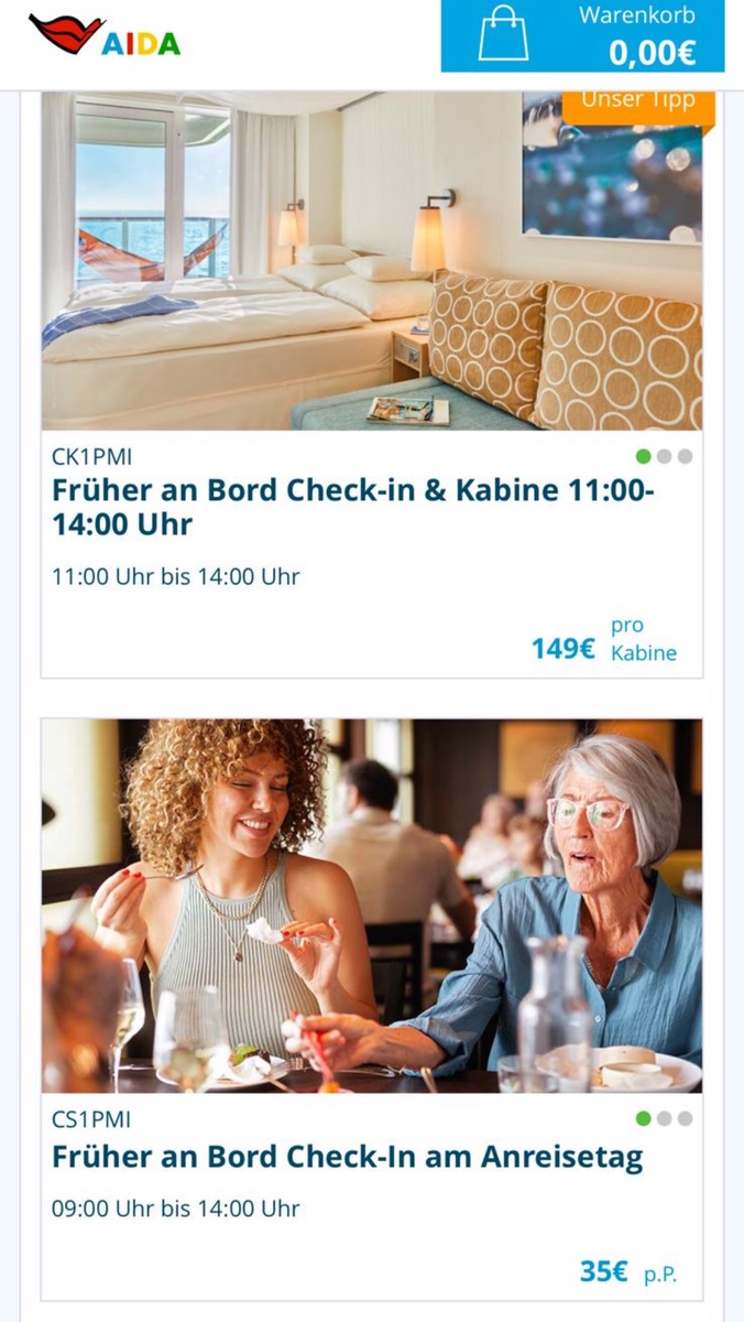 was meinst du mit Kombi mit Kabine buchbar? Ist es gemeint, Ihr möchtet die Early CheckIn inkl. sofortige Kabinennutzung (kostenpflichtig: ca. 120 EUR)? Diese Art der Buchung waren bei mir noch nicht freigeschaltet.