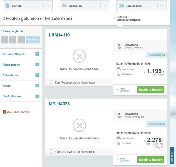 Da scheinbar die Routen komplett aus dem Verkauf genommen wurden sind, während die anderen Karibiktouren weiterhin buchbar sind, deutet das auf ein größeres Problem hin. Sonst ist AIDA beim Wegfall eines Hafens (siehe Amsterdam!) nicht so kleinlich. Dann lassen wir uns mal überraschen, ob das ein klassisches IT-Problem ist, oder da wirklich was im Busch ist.