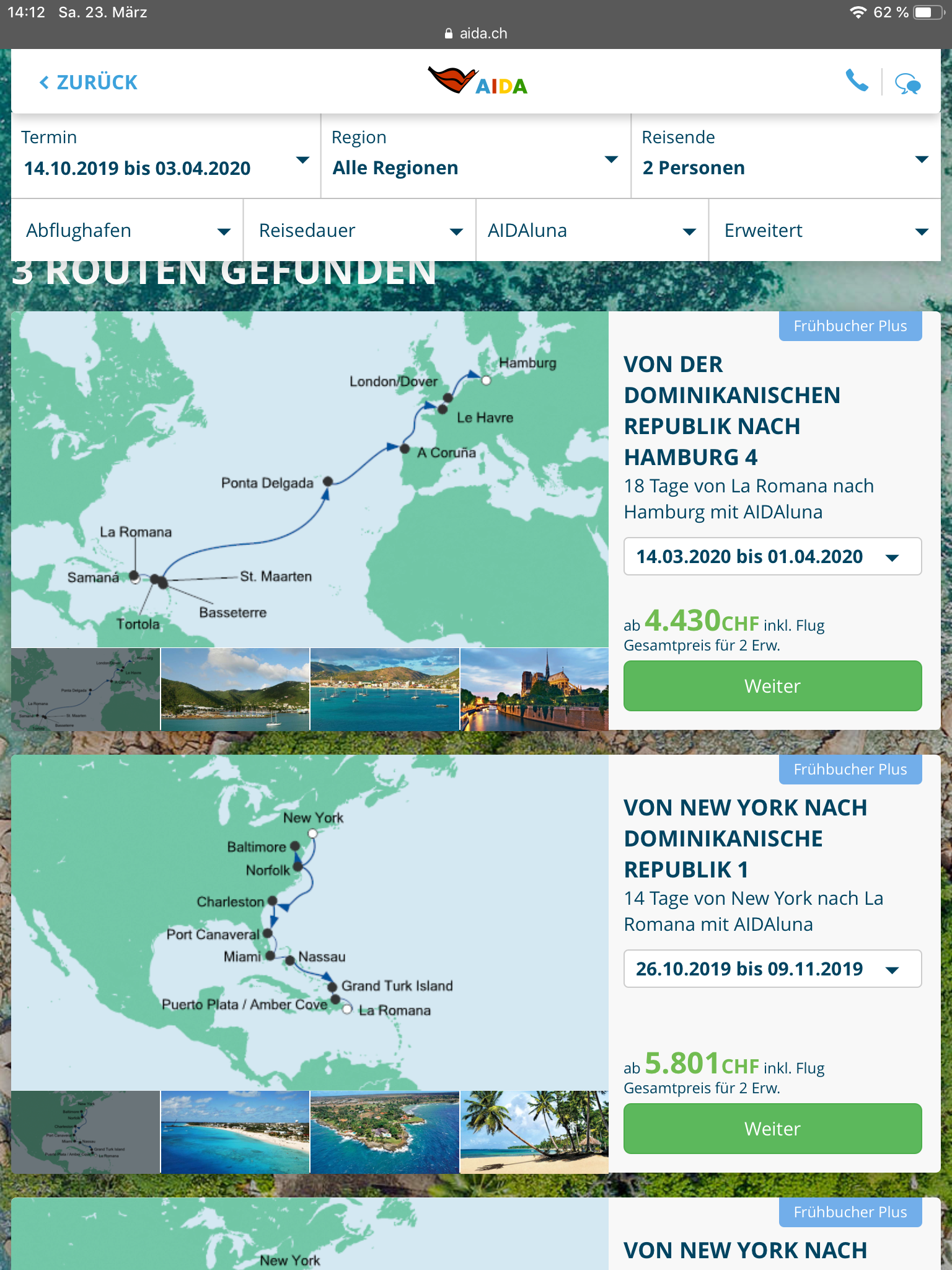 2. die erste buchbare Tour aus der Karibik ist die Transtour ab La Romana nach Hamburg.