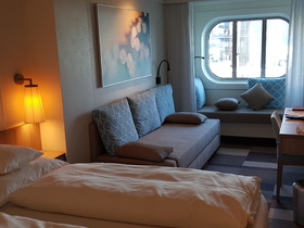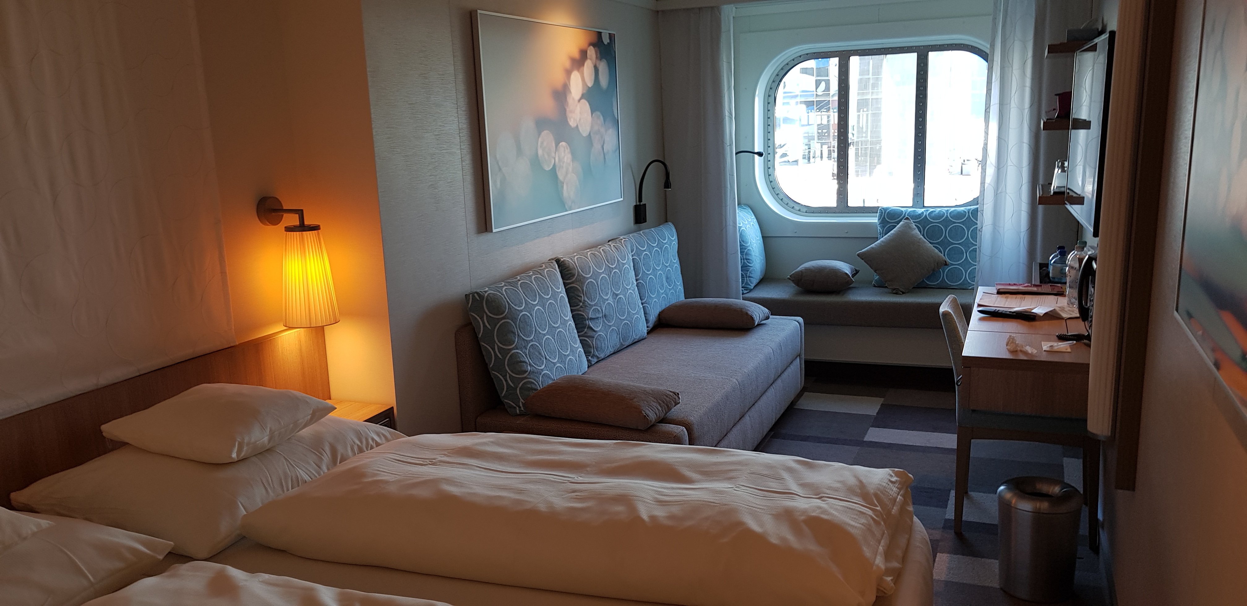 Ich hatte auf der Nova als Alleinreisende die Meerblickkabine 4082 mit begehbaren Kleiderschrank zugeteilt bekommen. Diese Kabine befindet sich Backbord vorne (Davor sind noch zwei Meerblickkabinen mit Bullaugen und 3 Innenkabinen). Mit 16,8 qm gehört diese Kabine zu den "kleineren" Meerblickkabinen, jedoch empfand ich den Platz als vollkommen ausreichend. Schön ist vorallem die kleine Couch direkt unter dem Fenster, auf der man schön sitzen bzw. liegen und rausschauen kann. Auch schön ist das sich dort eine Leselampe mit USB-Anschluss befindet.